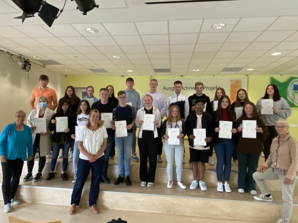 Das Angebot wird dementsprechend auch im neuen Schuljahr fortgesetzt. Die Lehrkräfte, die diese Leistung auch in positiven Zeugnisbemerkungen bezeugen, und die Schulleitung finden, dass diese Schülerinnen Schüler stolz auf die erbrachten Leistungen sein können. Auch aus diesem Grund wurden die Zertifikate im Rahmen einer Schulveranstaltung übergeben, ihnen unser Dank für ihr besonderes Engagement ausgedrückt und ihre gelungene persönliche Ausrichtung auf die Verbesserung ihrer Zukunftschancen gelobt. Außer den Zertifikaten erhielten die Schülerinnen und Schüler kleine Präsente der TELC Organisation und wurden, vom Förderverein der KGS Hambergen gesponsort, zum Pizzaessen eingeladen.
