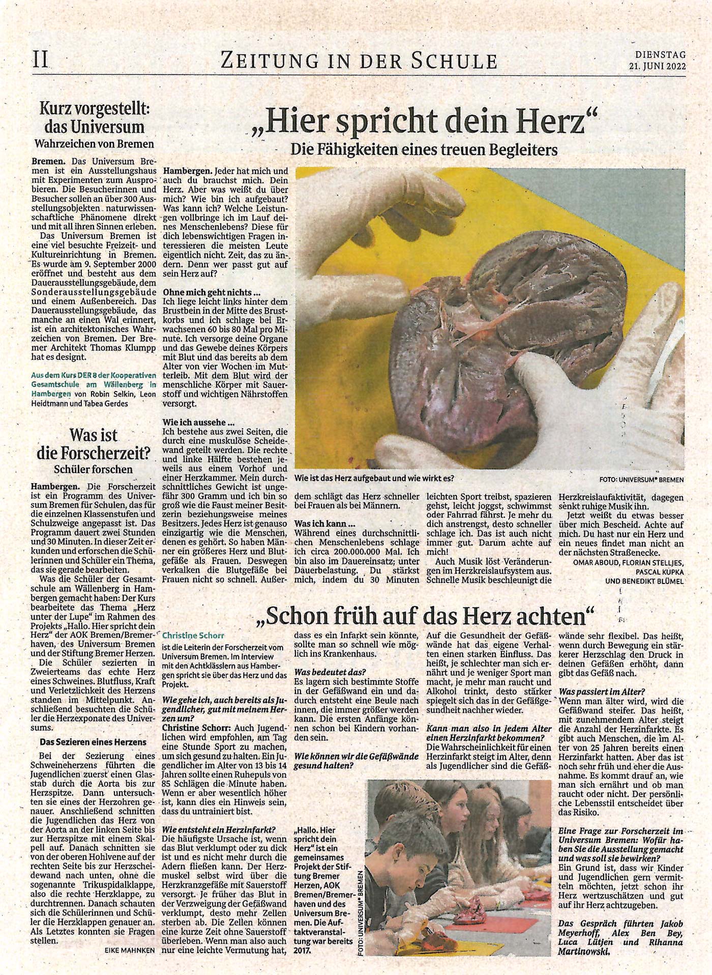 Hier spricht dein Herz – ZiSch-Projekt in Jg. 8 21 Juni,2022 admin Hier spricht dein Herz – ZiSch-Projekt in Jg. 8 Foto: Universum Bremen Quelle: Weser-Kurier vom 21.06.22 (ZiSch-Beilage)