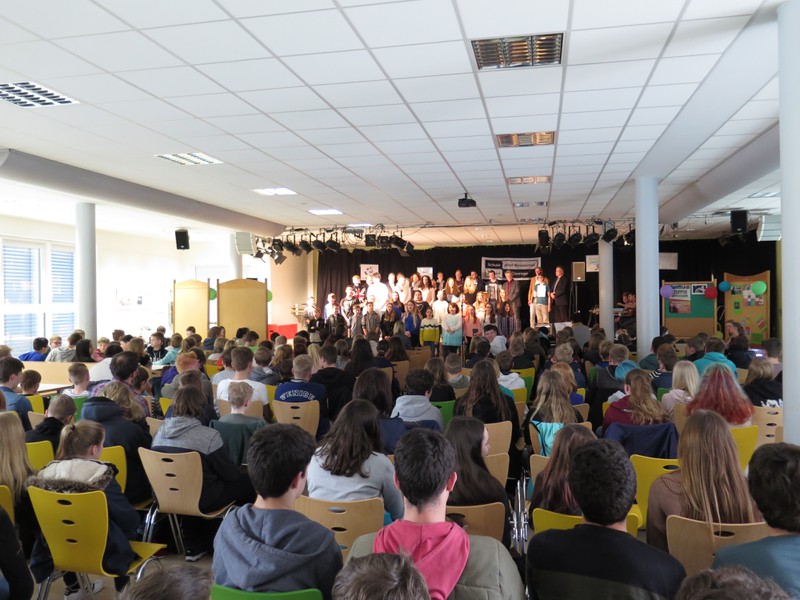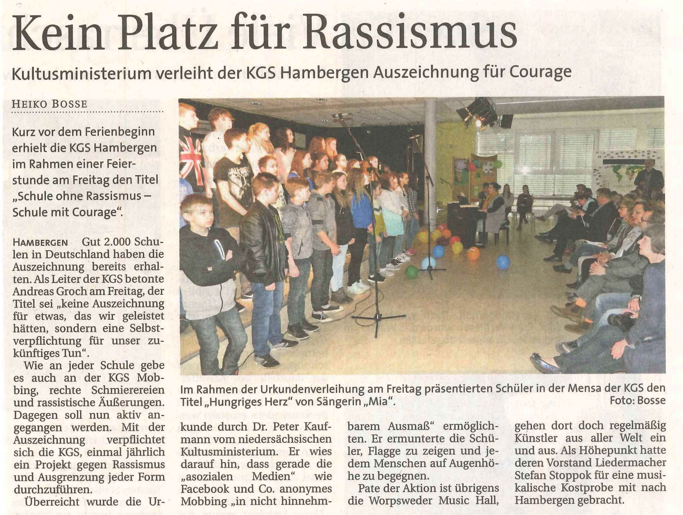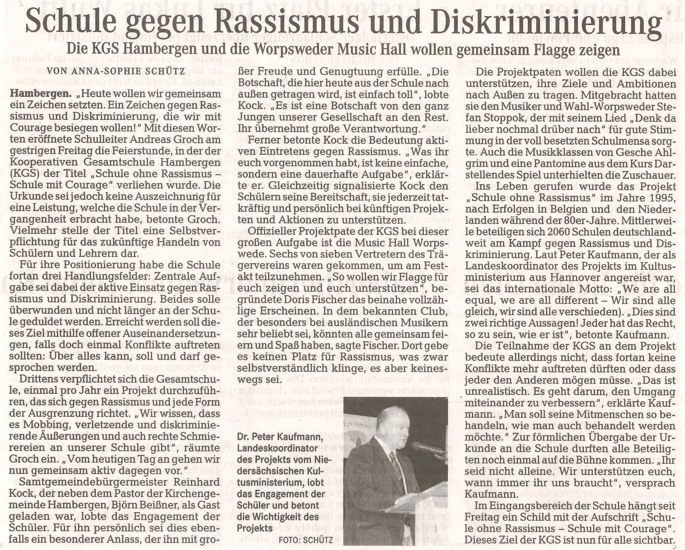 Im Rahmen einer musikalisch-künstlerisch geprägten Feierstunde, wurde unserer Schule der Titel "Schule ohne Rassismus - Schule mit Courage“ verliehen. Besonders freuen wir uns darüber, dass wir die MusicHall Worpswede als Partnerin gewinnen konnten. Großen Dank gebühren neben der Music-Hall Pastor Beißner und Samtgemeindebürgermeister Kock sowie Herrn Dr. Kaufmann vom Kultusministerium für ihre Redebeiträge und SchülerInnen der Klassen 6.1 und 10.1 sowie des WPK Darstellendes Spiel aus Jahrgang 7, die die Veranstaltung mit ihrem Gesang und ihrer Pantomime bereicherten und nicht zuletzt dem Liedermacher Stephan Stoppok für seinen musikalischen Beitrag. Ein spezieller Dank geht an Herrn Bertke, der sich intensiv und engagiert dafür eingesetzt hat, dass unsere Schule die Auszeichnung erhalten konnte.