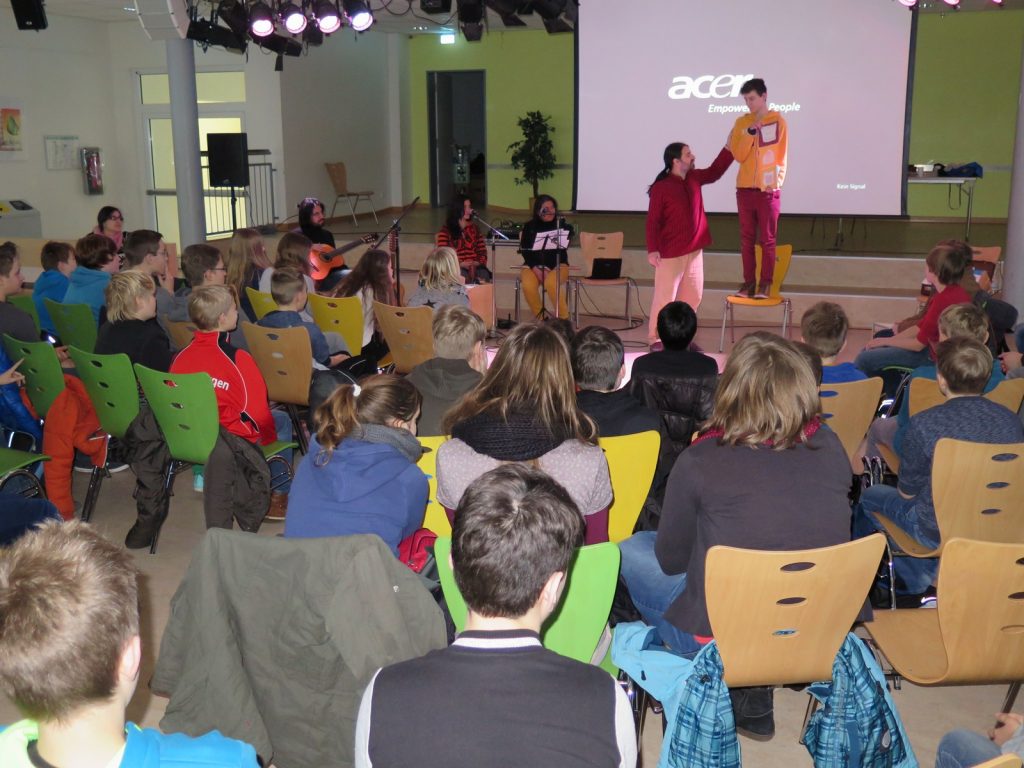 Am 23. Februar 2015 konnten die Schülerinnen und Schüler des 6. und 7. Jahrgangs der KGS Hambergen Märchen auf Spanisch erfahren. Die Künstlergruppe bestand aus Marcela, Yolanda, JoaquÌn aus Kolumbien und Jose aus Spanien, und heißt "Majunaì. Es war eine sehr schöne, gelungene Veranstaltung, aber lesen Sie selbst einige Schülerkommentare... "Ich fand es sehr gut, da man die Geschichte durch die Bilder, die Musik und die Körpersprache sehr gut verstehen konnte. Die Geschichten waren auch sehr gut. Dazu gab es noch ein paar kleine Spiele zum Mitmachen." Torben (6. Jahrgang) "Die Geschichten waren toll erzählt!!! Der Erzähler konnte gut die Geschichte erzählen. Man war richtig in der Geschichte drin und man hat alles mitgefühlt. Sie haben es sehr witzig gemacht, dass man lachen musste. Toll!" Mauricio (6. Jahrgang) "Am 23. Januar war etwas ganz Tolles in der Schule. Wir sind in die Mensa gegangen und dort haben wir uns Geschichten auf Spanisch angehört. Es war sehr schön und ich hätte nicht gedacht, dass ich so viel verstehe." Jana (6. Jahrgang) "Das "Theater Stück" hat mir sehr gut gefallen. Ich habe den größten Teil davon verstanden. Man konnte sehr viel mitmachen. Es war ein guter Schauspieler und die Musik hat mir auch sehr gut gefallen." Sophie (7. Jahrgang)