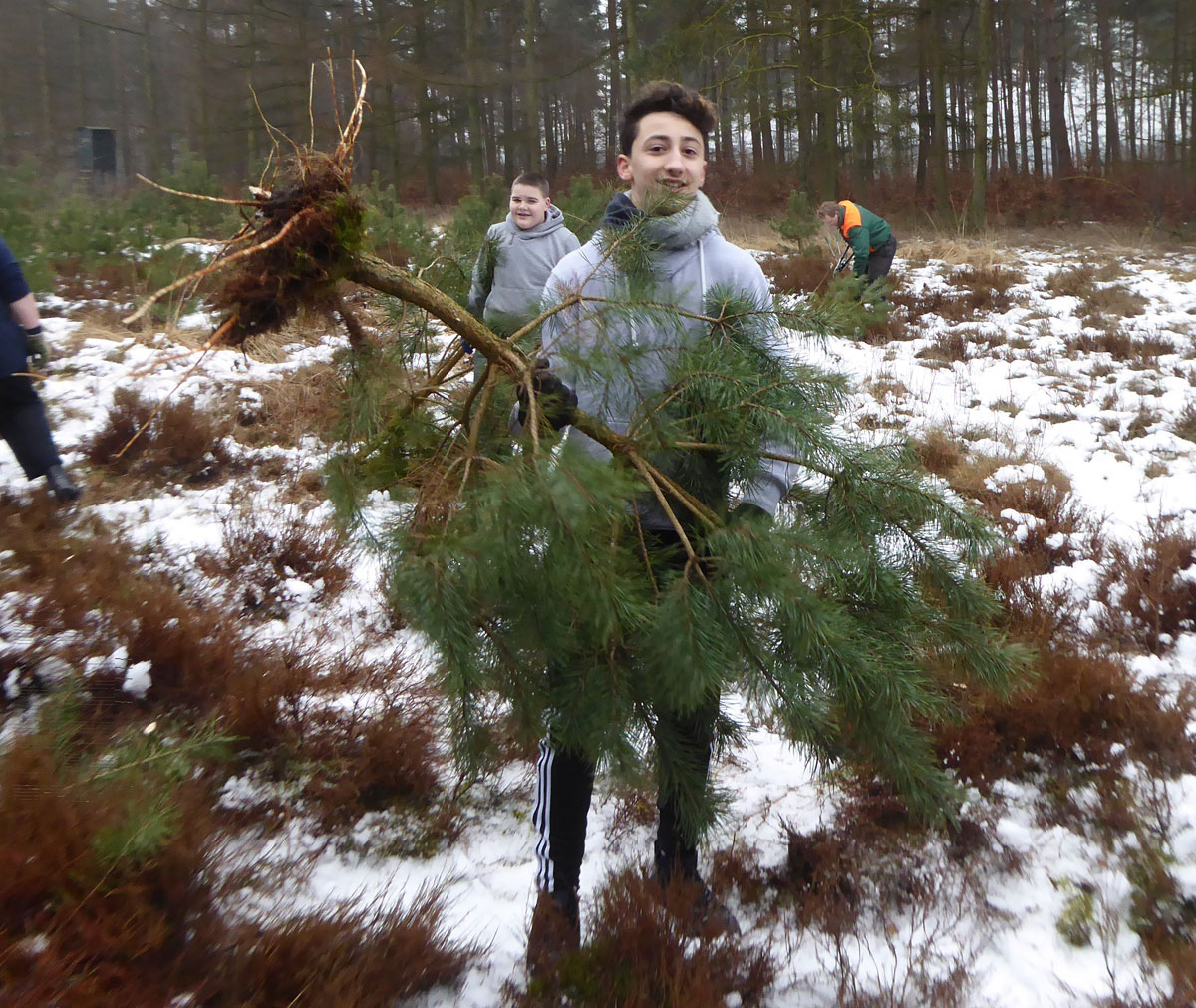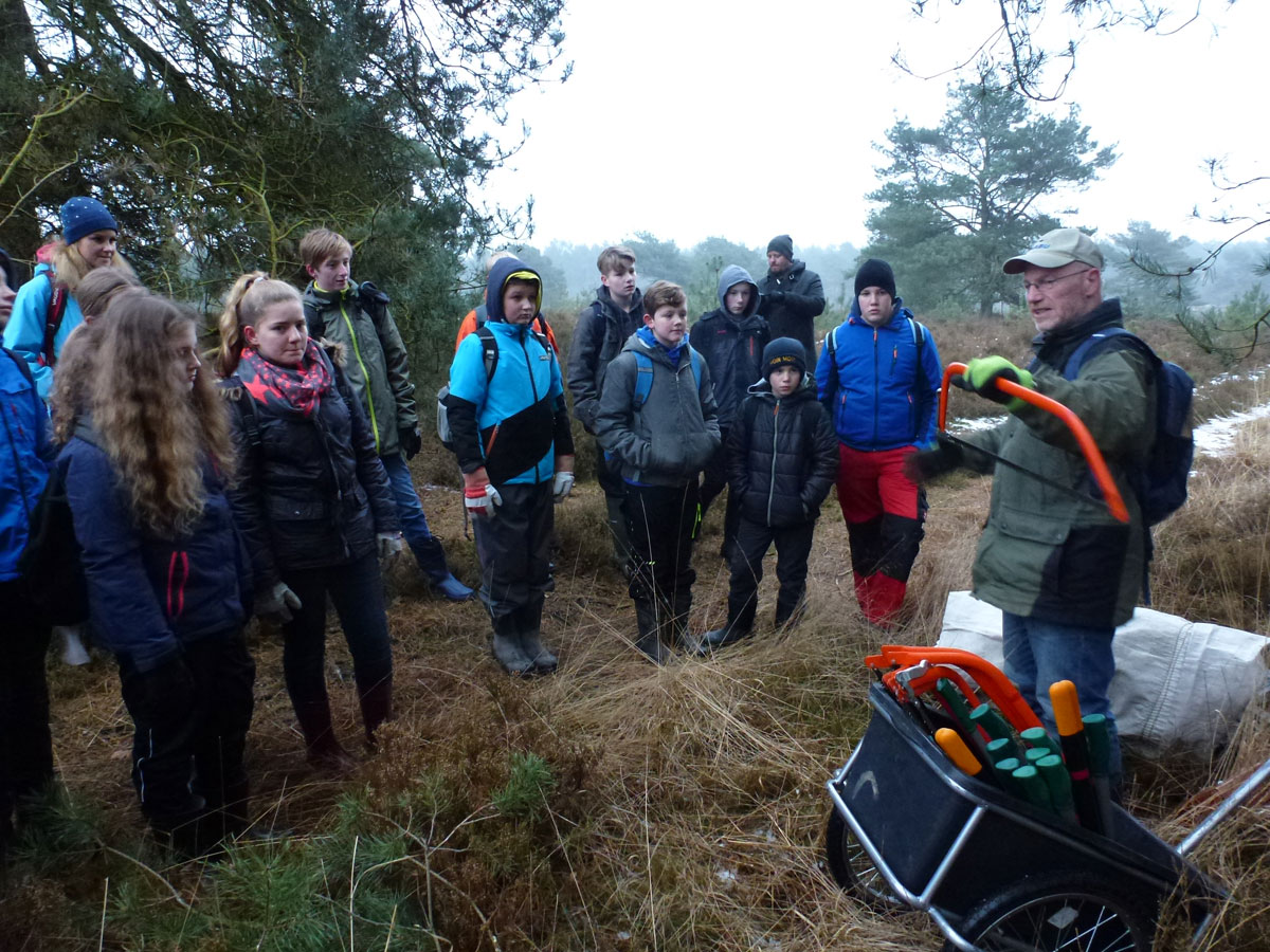 Am 23.01.2017 trafen sich die Klassen 7.1, 7.2 und 7.6 am Wasserwerk Wallhöfen, um von dort aus in zugängliche Bereiche des Heilsmoores zu ziehen. Kiefern wurden am Boden abgesägt, die Birken in 1m Höhe. Der NABU übernimmt die Nacharbeiten mit Beil und Machete das Entasten und Spalten der Birkenstämme.