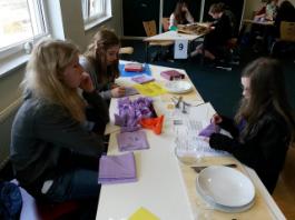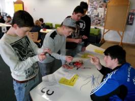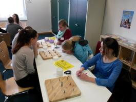 Die Schülerfirma, Abteilung Schulservice, hat für den 8. Jahrgang den Praxisparcours aufgebaut. An insgesamt 17 Stationen können die Jugendlichen ihre Fähigkeiten und Fertigkeiten ausprobieren. Das Angebot ist vielfältig, z. B. Schrauben und Muttern unter Zeitvorgabe montieren, einen Tisch decken oder einen Stromkreis aufbauen.
