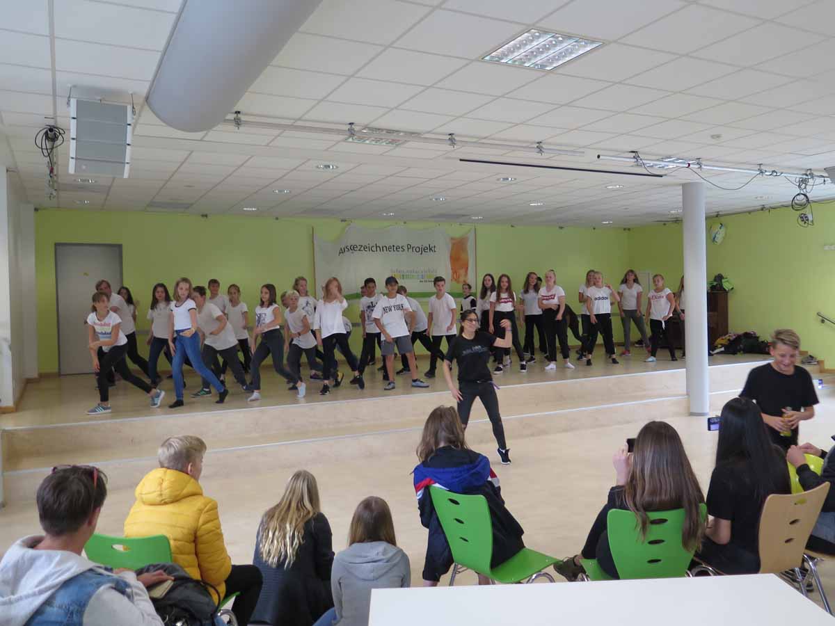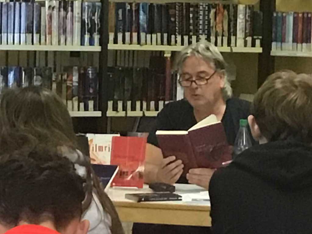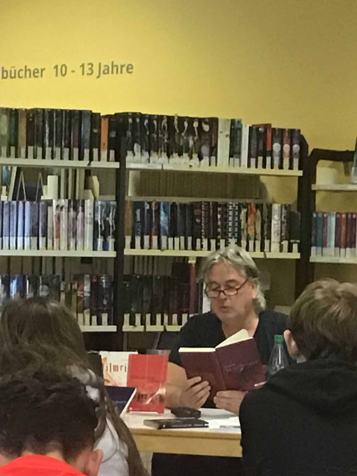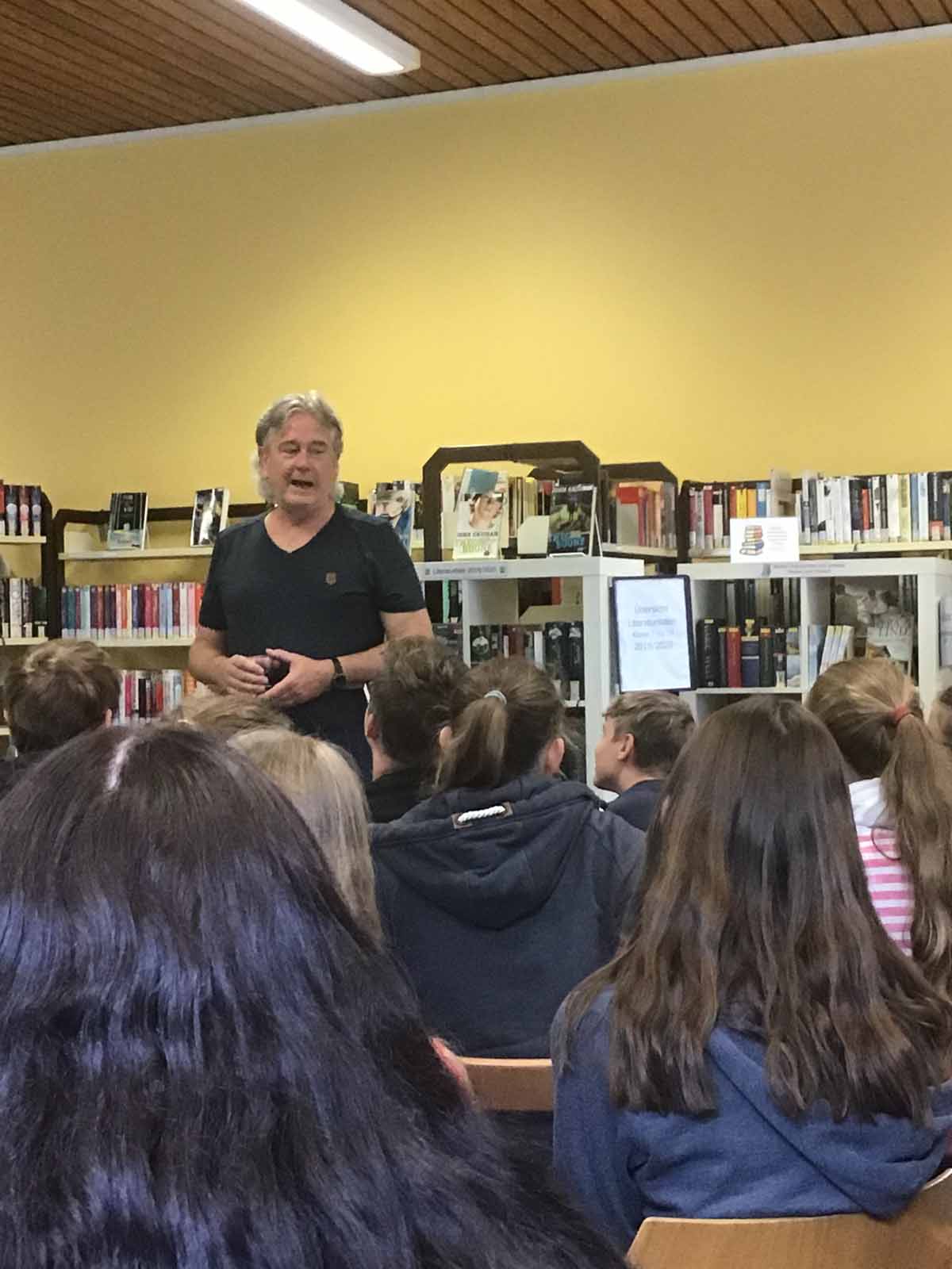 Party fatal Olaf Büttner liest vor Neuntklässlern/-innen in der Gemeindebücherei.