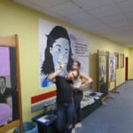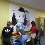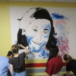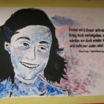 Neben der Ausstellung fertigten die SchülerInnen des Wahlpflichtkurses Politik des Jahrgangs 9 ein großes Wandbild von Anne Frank an, verbunden mit einem Zitat aus ihrem Tagebuch.
