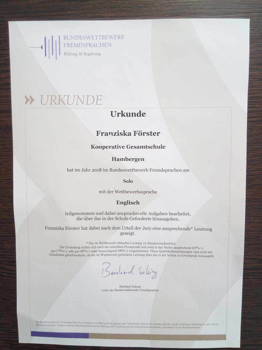 Franziska Förster aus unserer Klasse 8.6 wurde für einen englischen Textbeitrag im Rahmen des „Bundeswettbewerbs Fremdsprachen“ ausgezeichnet.