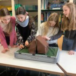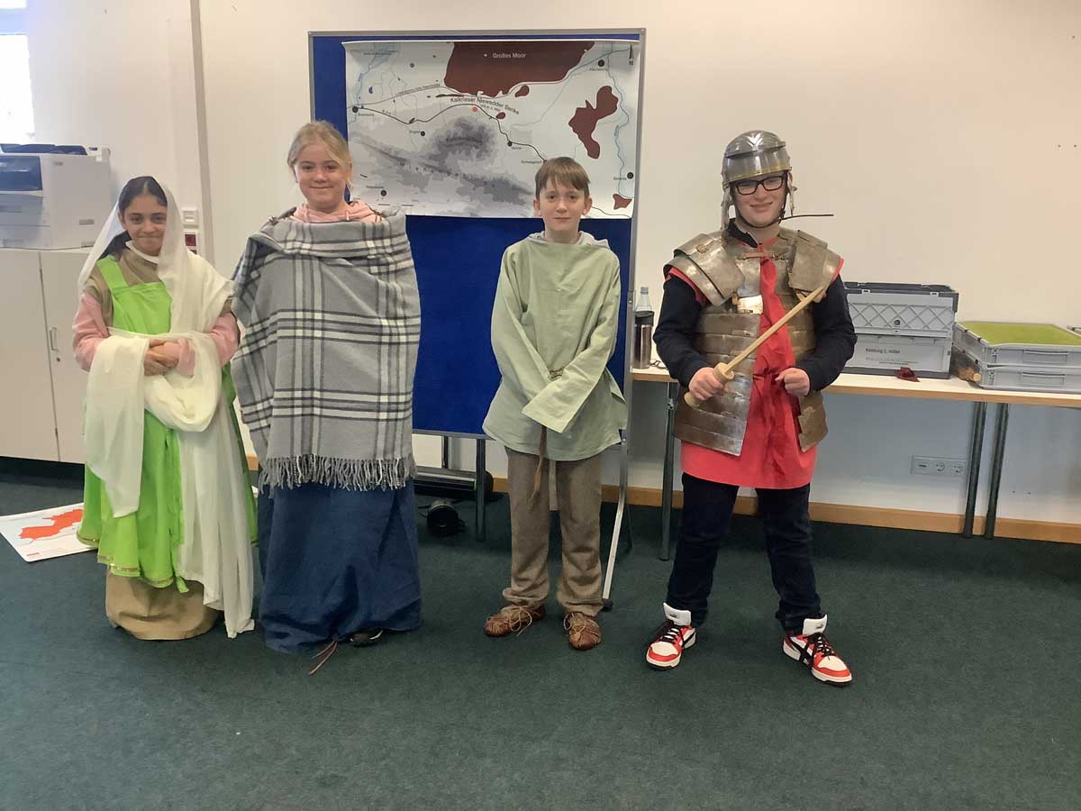 Nach Lerngruppen aufgeteilt erlebten die Schülerinnen und Schüler ein 90-minütiges abwechslungsreiches Programm, das ganz im Zeichen der Römer und Germanen stand. Die Museumsmitarbeiterinnen konnten interessant und anschaulich die Geschichte der Varusschlacht vermitteln. So durften die Schülerinnen und Schüler authentische Kleidungsstücke anziehen und sich wie richtige Römer und Germanen fühlen. Die Geschichte der Varusschlacht wurde mithilfe von Kartenmaterial und Repliken von echten archäologischen Fundstücken anschaulich erklärt. So konnte eine originalgetreue Reitermaske präsentiert werden, wohl das berühmteste Fundstück im Museum Kalkriese. Bemerkenswert war, dass die Schülerinnen und Schüler bereits über ein breites Vorwissen zu der Schlacht aus dem Unterricht hatten und sich so am Gespräch beteiligen konnten. Abschließend wurde das römische Legionärsleben thematisiert. Erneut durften die Schülerinnen und Schüler sich aktiv einbringen und ein Legionärszelt aufbauen und auf dem Schulhof römische Formationen einüben. Als gestandene Legionäre konnten die Schülerinnen und Schüler auch einen Angriff simulieren, indem sie andeuteten, wie man den römischen Pilum (Wurfspeer) wirft und sich wieder in die Formation eingliedert. Insgesamt bleibt der Eindruck bei den Lehrkräften und Schülerinnen und Schülern, dass der Museumsbesuch spannend, interaktiv und vor allem lehrreich war.