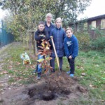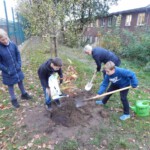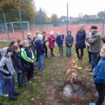 Hier gibt es eine ganze Reihe SchülerInnen, die sich engagieren wollen und denen aktiver Umweltschutz schon jetzt ein Bedürfnis ist. So trafen sich am 26.10.2018 drei SchülerInnen in den frühen Morgenstunden mit Wolfgang Vogel vom NABU Hambergen, um dem Baum ein neues Zuhause zu geben. Unter seiner fachkundigen Anleitung wurde der Boden großräumig gelockert, ausgehoben und vorsichtig mit Nährstoffen angereichert. Natürlich gesellte sich auch die Schulleiterin dazu mit der Botschaft: „Ich rede nicht nur darüber. Ich mache mit!“