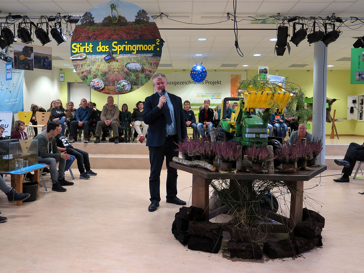 Eigentlich waren Christin Pape (Klasse 8.5) und Tammo Freese (Klasse 8.4) nur gekommen, um zur Feierstunde anlässlich der Übergabe der Moorpatenschaft am 21.11.2016 das Fotobuch an den neuen siebten Jahrgang zu übergeben. Zum 14. Mal, denn so lange gibt es die Patenschaft zwischen der NABU-Ortsgruppe und der Gesamtschule am Wällenberg schon. Seitdem kämpfen Schule und die NABU-Aktiven gemeinsam gegen die Austrocknung des Heilsmoores bei Wallhöfen.