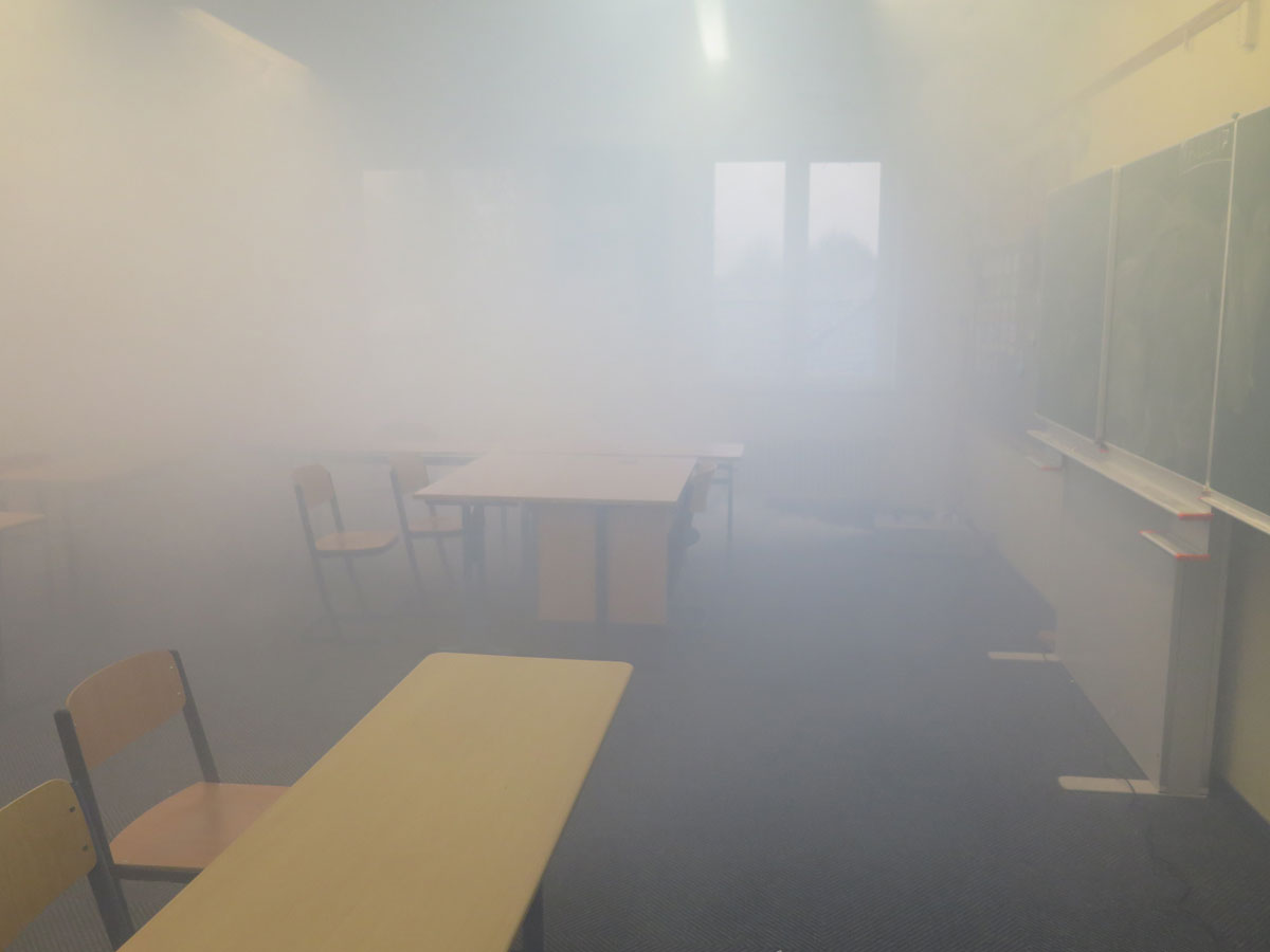 Sirenenalarm in Hambergen, Feuerwehr, Polizei und Rettungswagen vor der KGS, dichter Rauch quillt aus dem Raum O15, zwei KollegInnen stehen am offenen Fenster und rufen laut um Hilfe. Schon ist der Einsatzwagen der Feuerwehr auf dem Gelände. Ein Atemschutztrupp bahnt sich seinen Weg durch das Gebäude. Die Kameraden stellen von außen die Leiter an, über die dann die Eingeschlossenen sicher gerettet werden können.