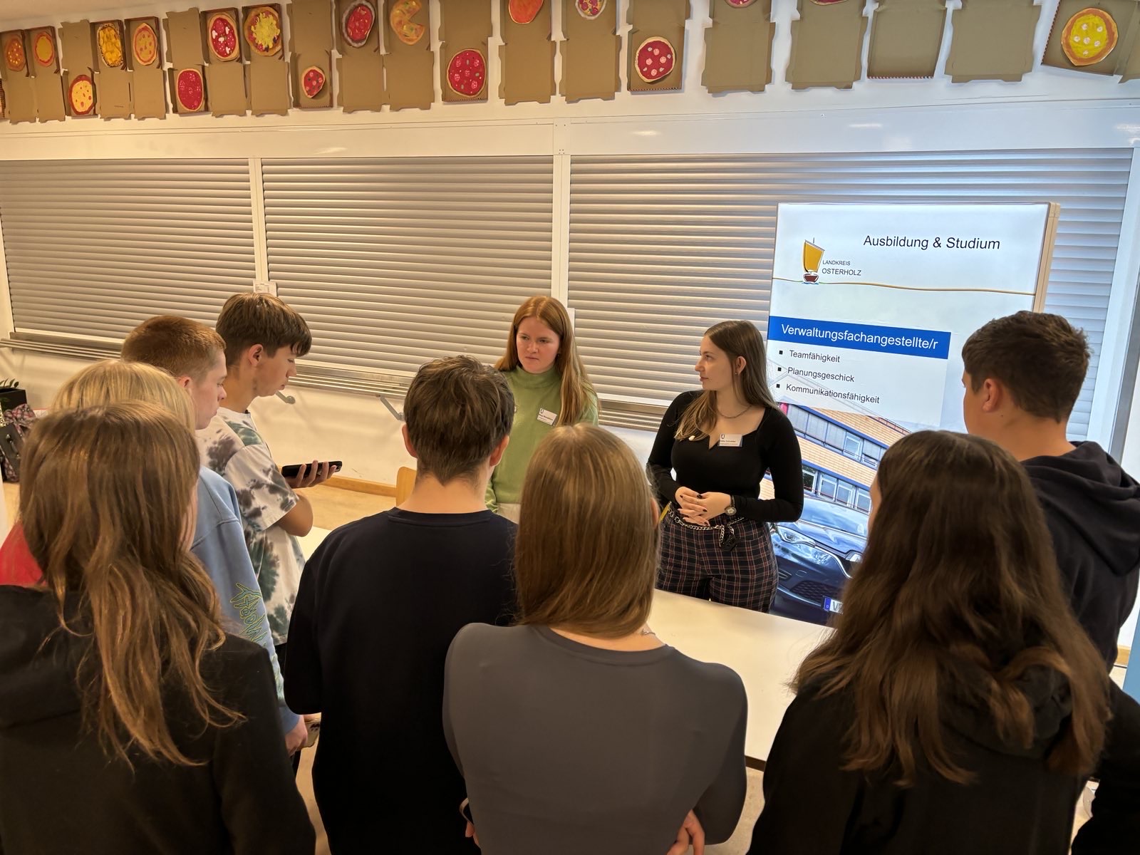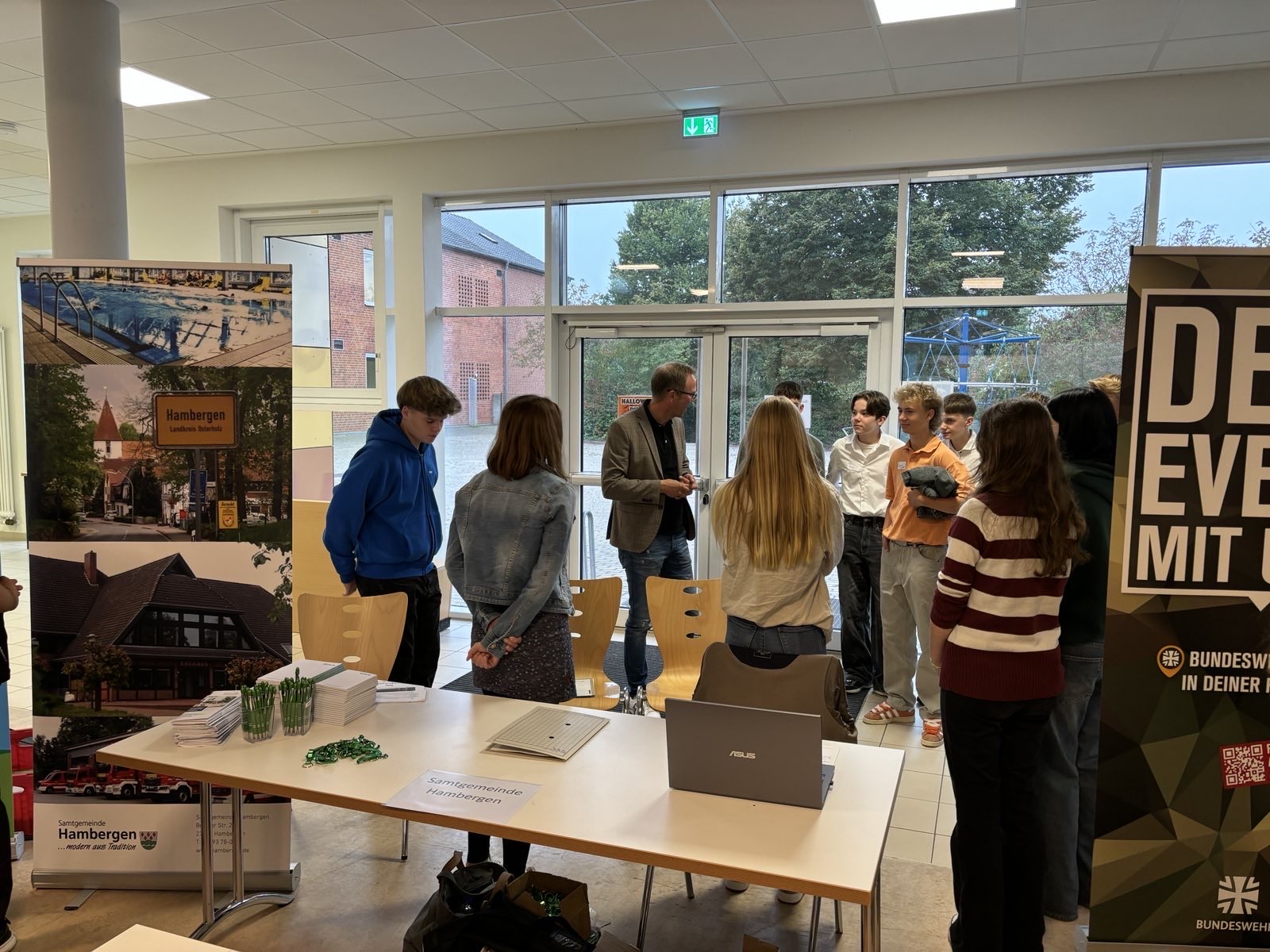 ie KGS Hambergen hatte am 19.09.2024 ein gutes Dutzend Betriebe und Verwaltungen aus der Region zu einer hauseigenen Berufsorientierungsmesse eingeladen – mit Erfolg! Mehr als 100 Schüler*innen des 9. Jahrgangs konnten an den Ständen mit den Verantwortlichen und Auszubildenden der Betriebe und Verwaltungen direkt ins Gespräch kommen, so dass die Jugendlichen sich ein Bild von ausgewählten Berufsbildern und –branchen machen konnten. Alle waren sehr interessiert und hatten Freude, praktische Übungen zu machen und Beratung zu erhalten. „Mich hat überrascht, was die Unternehmen heute den Auszubildenden in der Ausbildung an Möglichkeiten bieten!“, so eine Schülerin.