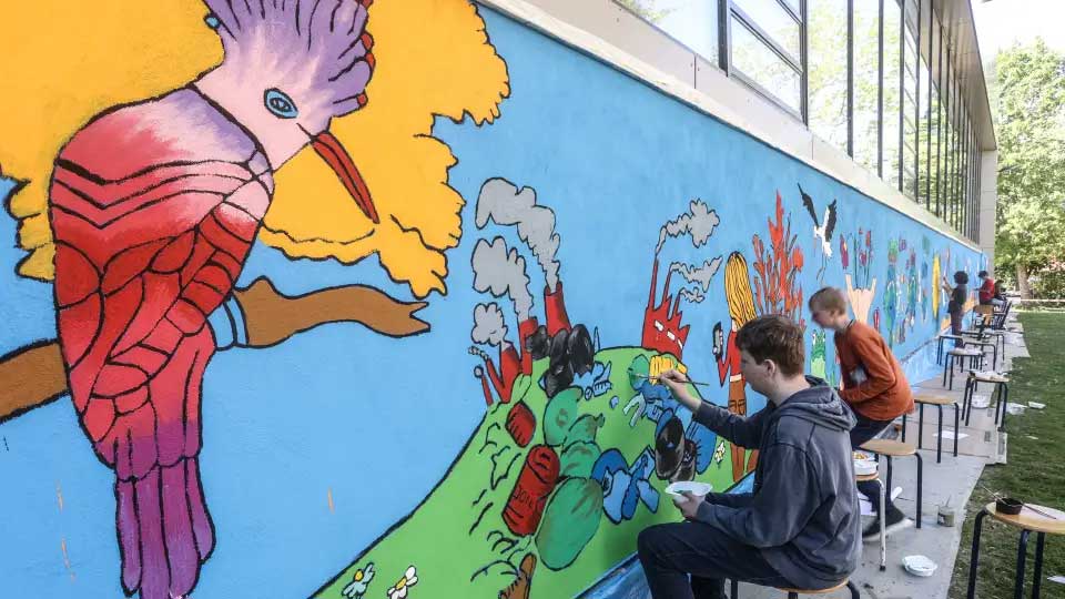 Ein Wandbild der KGS Hambergen erzählt eine Geschichte von Umwelt- und Klimaschutz. So haben es 30 Schüler zum Leben erweckt.