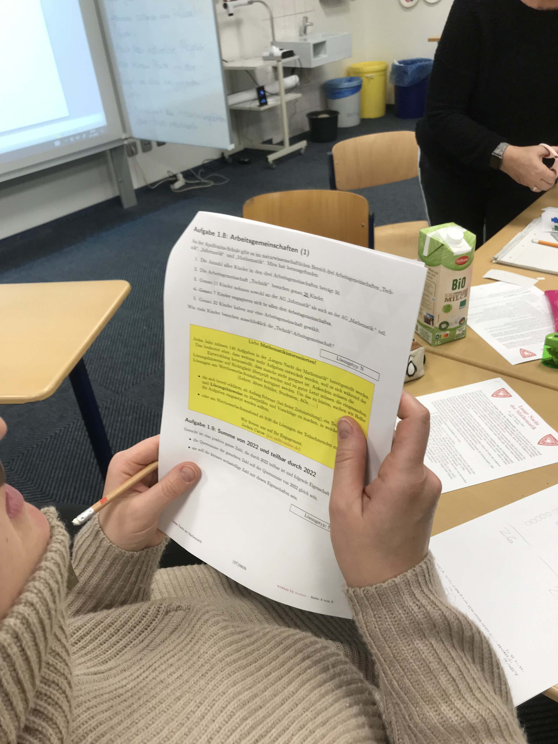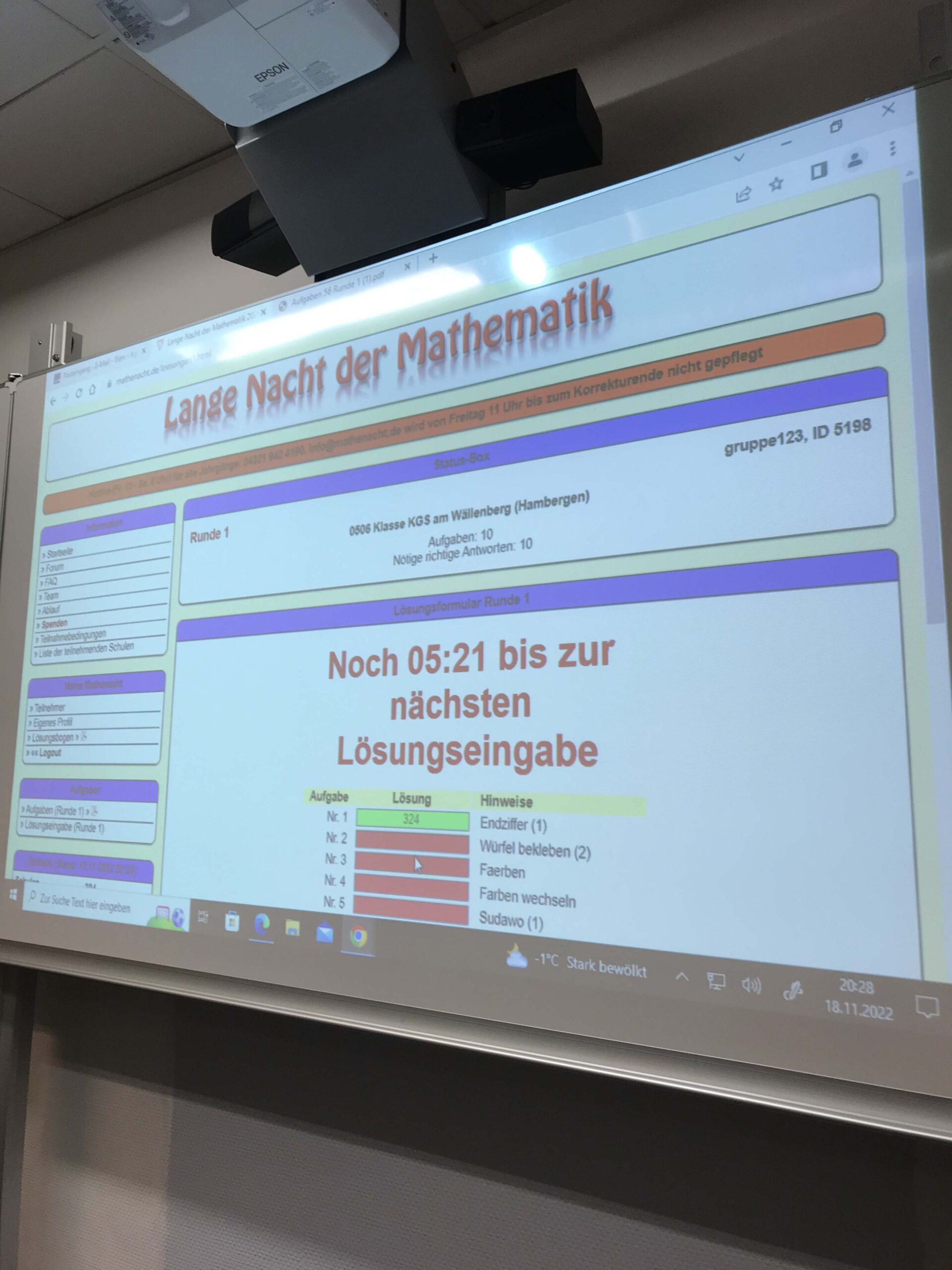 Es ist (endlich) wieder „Lange Nacht der Mathematik“ in der KGS Hambergen. Knapp 30 Schüler*innen der Jahrgänge 6 – 10, einige Lehrkräfte, sowie einige Ehemalige haben die Nacht vom 18.11. auf den 19.11.22 zum Tag gemacht, um sich intensiv mit mathematischen Rätseln, Aufgaben und Knobeleien zu beschäftigen und der möglichst richtigen Lösung entgegenzufiebern. Als Belohnung dient der Einzug in die zweite Runde, um dann neue Aufgaben zu erhalten und sich an noch kniffligere Aufgaben zu setzen. In ganz Deutschland nahmen insgesamt 17.200 Schüler*innen an 394 Schulen an der diesjährigen „Mathenacht“ teil. Und auch unsere Schüler*innen arbeiteten konzentriert bis zum gemeinsamen Abschlussfrühstück um 6 Uhr morgens. Respekt euch allen und vielen Dank den beteiligten Lehkräften! Bis zum nächsten Mal.