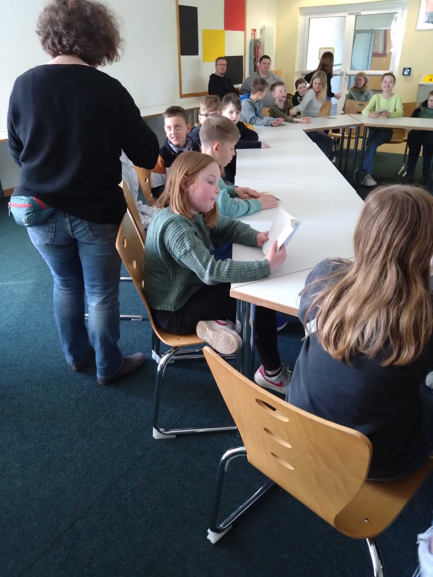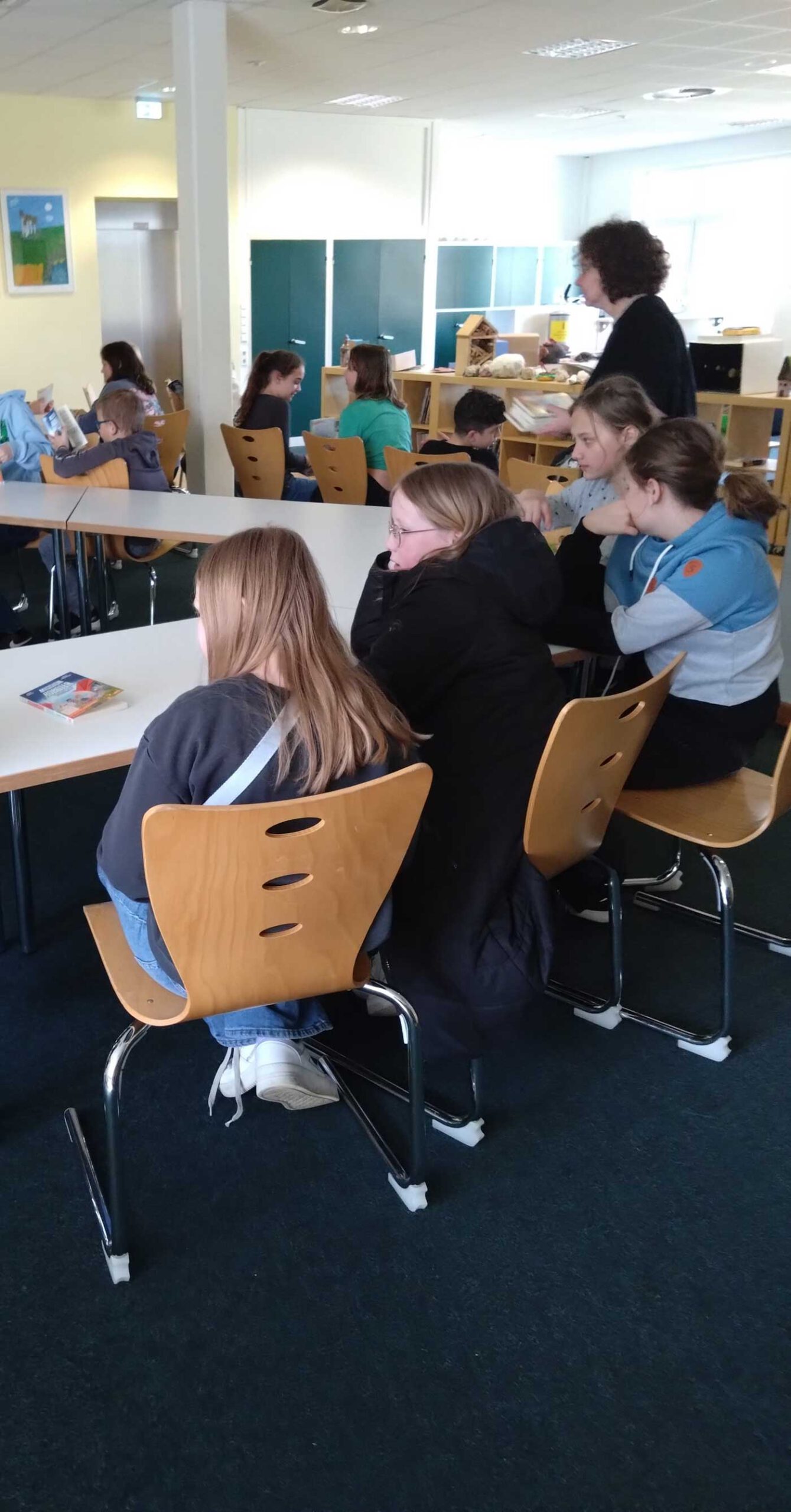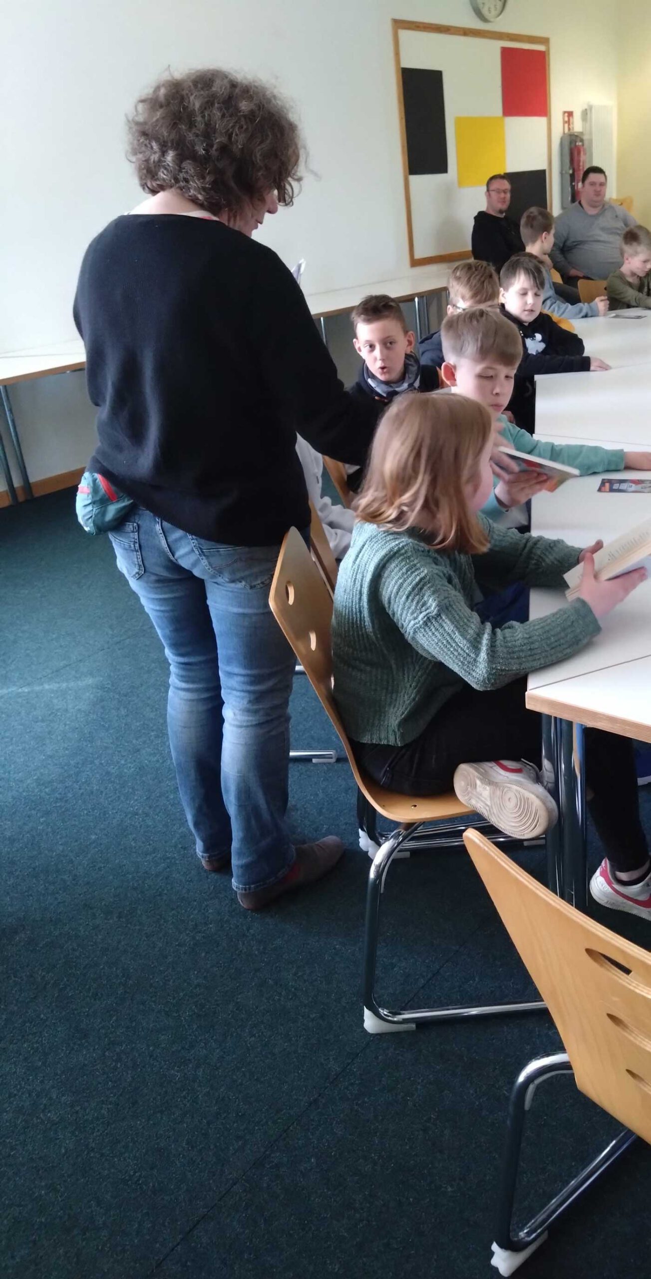 Mit dem diesjährigen Exemplar: „Mission Roboter“ von Anke Girod soll ihre Freude am Lesen geweckt oder unterstützt werden. Den Erfolg verdankt die Aktion vor allem den zahlreichen Buchhändler/-innen, die das Welttagsbuch bestellen, um es den Schüler/-innen zu schenken. So war dieses Jahr Frau Weißenborn von der Buchhandlung „Die Schatulle“ aus Osterholz-Scharmbeck zu Gast. Sie schenkte aber nicht nur, sondern las gleich auch noch das erste Kapitel den anwesenden Klassen vor.