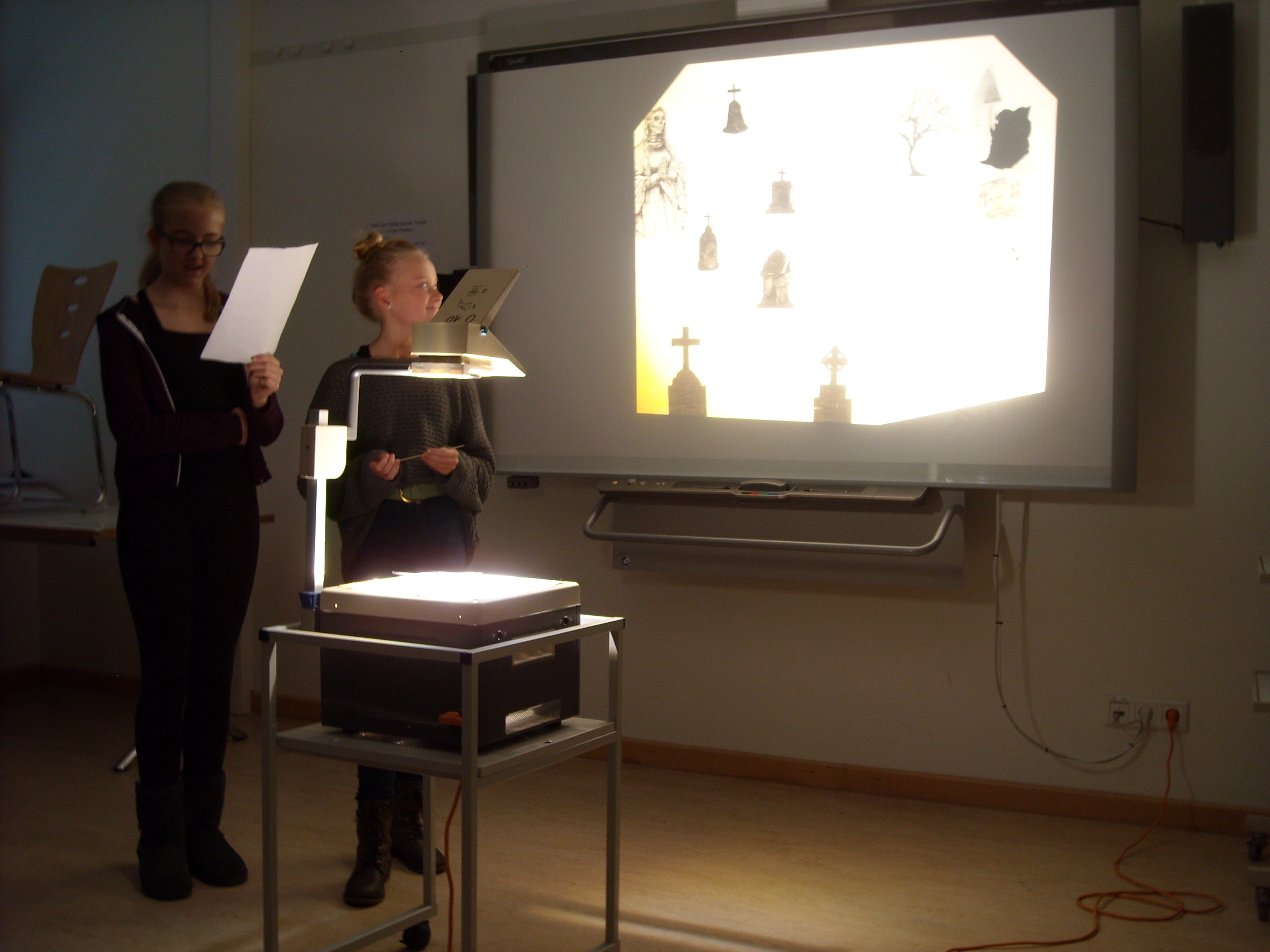 Auf den Spuren von Goethe, Fontane und Kästner und vielen anderen präsentierten am vorletzten Tag vor den Weihnachtsferien die Schüler/-innen dann ihre Ergebnisse. Schaurig und schön zeigten sich die Balladen, die die Schülerinnen und Schüler bearbeitet hatten: Drei Monitore in der schuleigenen Mediathek flimmerten mit Kurzfilmen eineinhalb Stunden lang, im Musikraum konnte man die akustischen Ergebnisse erleben, der Kunstraum war mit Plakaten und Objekten belegt.