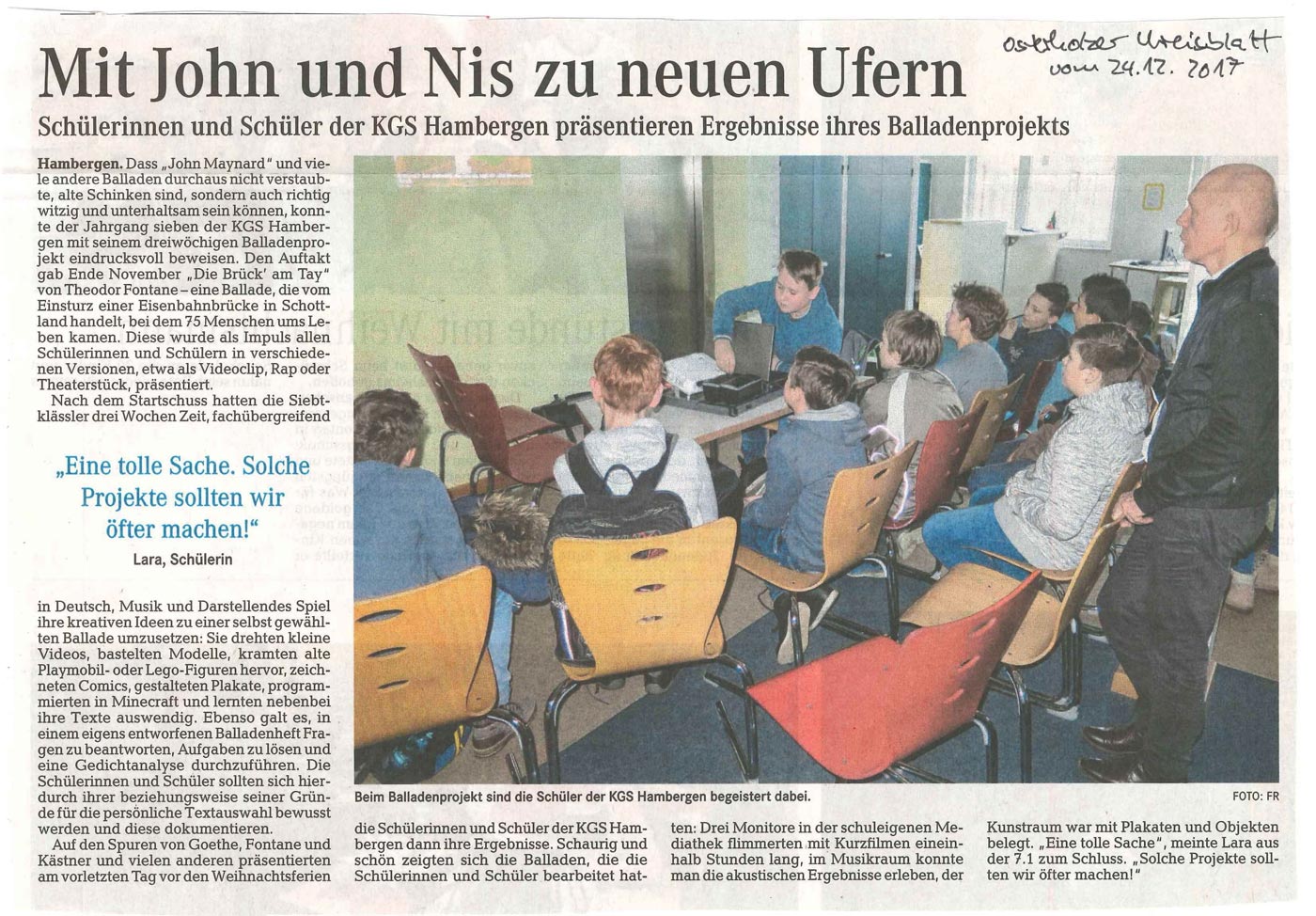 Dass „John Maynard“ und viele andere Balladen durchaus nicht verstaubte, alte Schinken sind, sondern auch richtig witzig und unterhaltsam sein können, konnte der Jahrgang 7 der KGS Hambergen mit seinem 3-wöchigen „Balladenprojekt“ eindrucksvoll beweisen