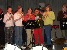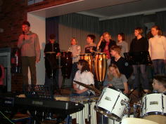 Nach den Proben der Vorwochen waren alle gut vorbereitet: die vorführenden Klassen, der Chor, die Theaterdarsteller, die Bands und die Tänzer. Und so konnte es am 27.03.03 im voll besetzten Saal der KGS Hambergen richtig losgehen - losgehen mit dem ersten größeren Schulkonzert der Gesamtschule am Wällenberg. Zu hören und zu sehen war ein abwechselungsreicher Mix aus unterschiedlichen Liedern, Tänzen, Percussioneinlagen und Theater.