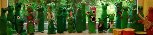 Das Froschorchester spielt auf. Ein Projekt der Klasse 6.6 mit ihrer Kunstlehrerin Insa Meyerholz. Entstanden sind die verschiedensten Musikerinnen und Musiker aus Pappmaché. Grundlage bildete eine Plastikflasche, die zunächst beklebt und später bemalt wurde.
