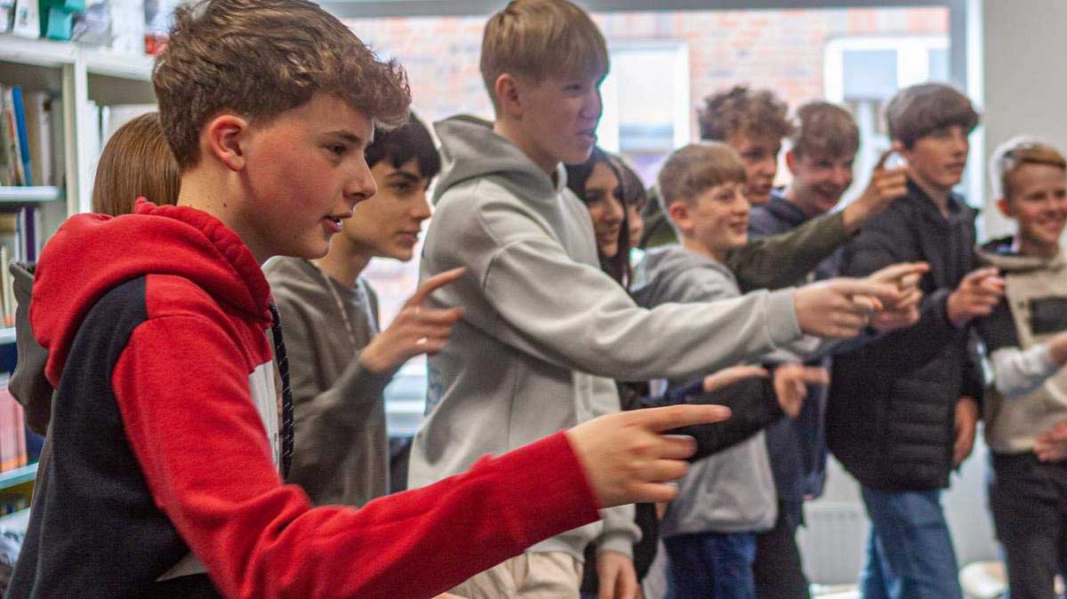 Der Text ist das eine. Beim Poetry-Slam kommt es aber auch darauf an, den Zuschauer einzufangen. Böttcher lässt die Schüler durcheinanderlaufen. Auf ein Zeichen sollen sie stoppen, quasi einfrieren. Es ist eine Übung aus dem Theaterbereich und Poetry-Slam ist auch eine Art Aufführung, bei der die vierte Wand überwunden werden muss. Eine Bühne ist normalerweise an drei Seiten begrenzt. Die vierte ist die Öffnung zum Zuschauerraum. Dahinter befindet sich für die Schauspieler ein „schwarzes Nichts“. Trotzdem muss ein Kontakt zum Zuschauer geschaffen werden. „Man muss hinschauen.“