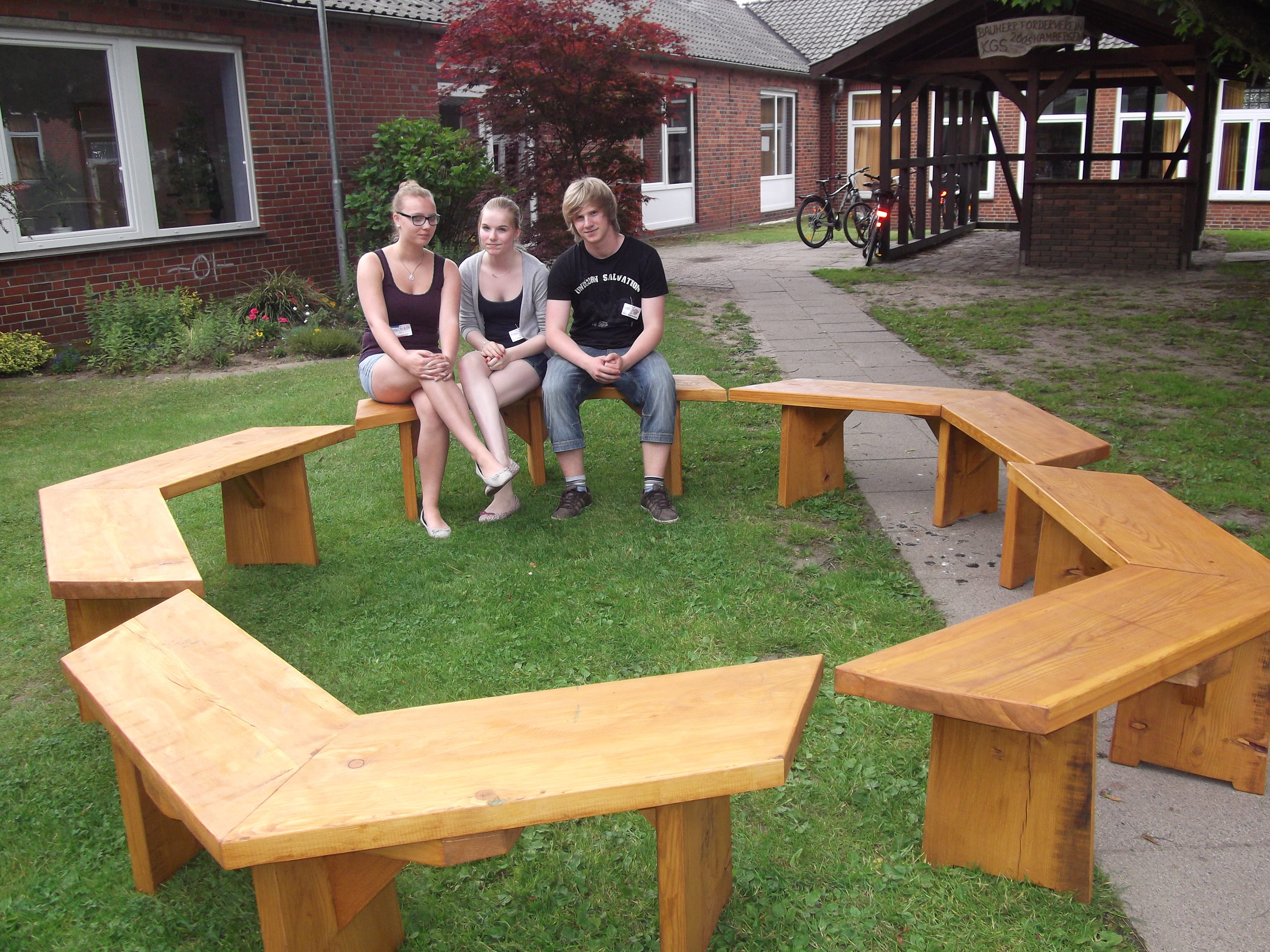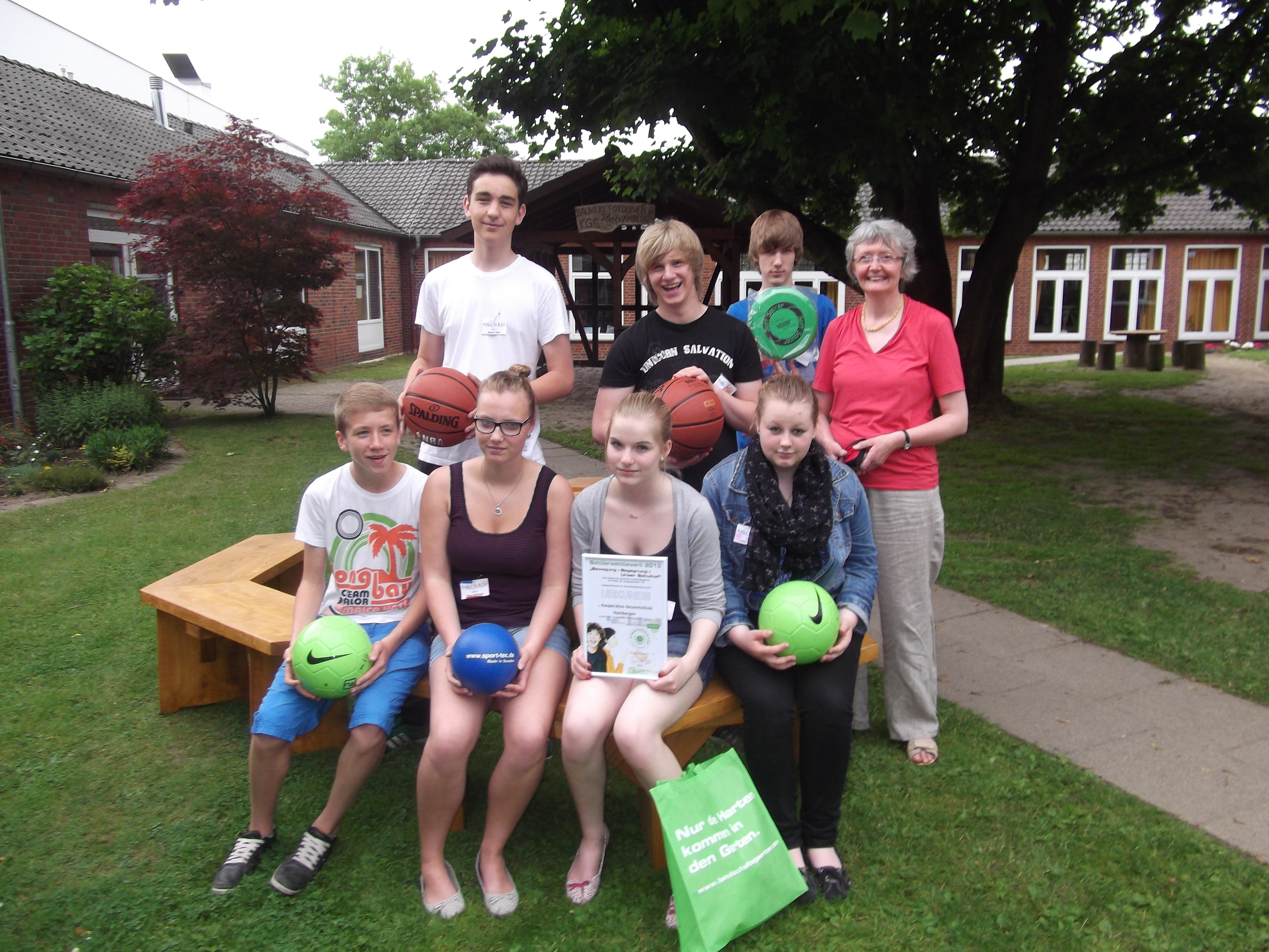 Seit vielen Jahren gibt es an unserer Schule die Schülerfirma. Eine der großen Abteilungen ist der Schulservice. Hier werden sowohl die Außenanlagenh des Schulgeländes gepflegt als auch Reparaturen und Renovierungen erledigt. Bewerber müssen deshalb handwerkliches Geschick mitbringen und Freude an der Arbeit im Freien haben. In diesem Jahr hat Schulservice außerdem am Wettbewerb "Bewegung + Bewegung = Unser Schulhof" des Verbandes der Garten- Landschafts- und Sportplatzbau Niedersachen-Bremen e.V. teilgenommen. Dafür hat die Abteilung einen Fragebogen erstellt und in allen Jahrgängen eine Befragung durchgeführt. Die Ergebnisse wurden tabellarisch und als Collage dargestellt. Jetzt gab es den Preis: Zwei Fußbälle, zwei Basketbälle und zwei Softspielgeräte. Nach den Sommerferien ist alles in der Ballausgabe zu finden. Außerdem wurden von der Abteilung sechs neue Schulbänke gestrichen. Danke an den Förderverein für die Bänke. Nach den Sommerferien kann außerdem wieder Schach gespielt werden. Die Figuren stehen zur Ausleihe bereit.
