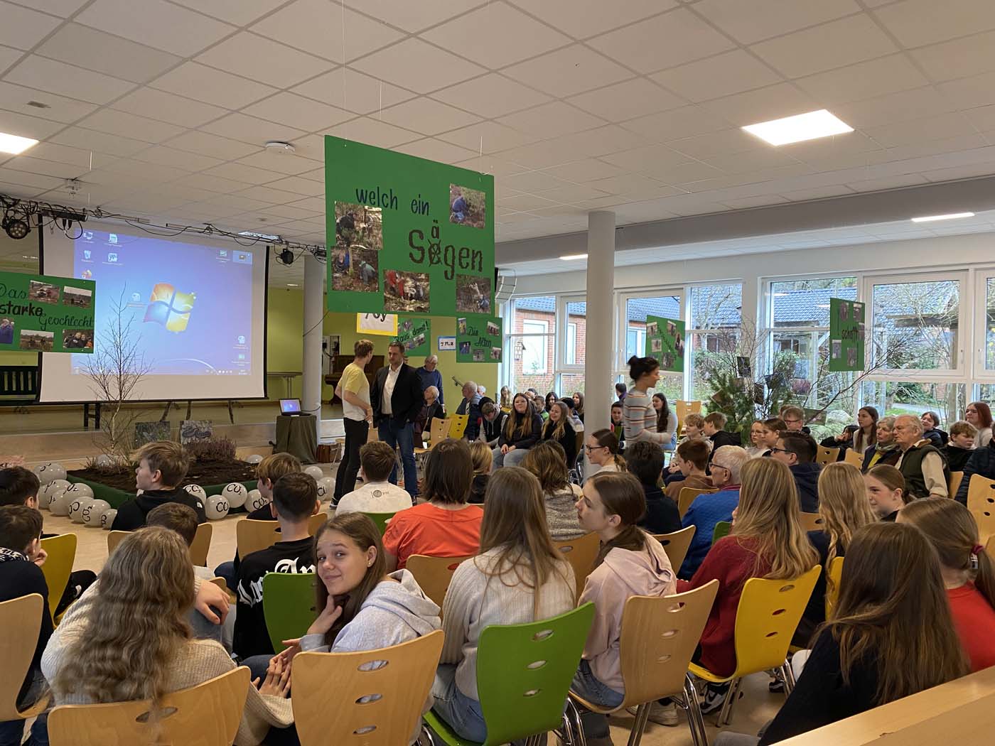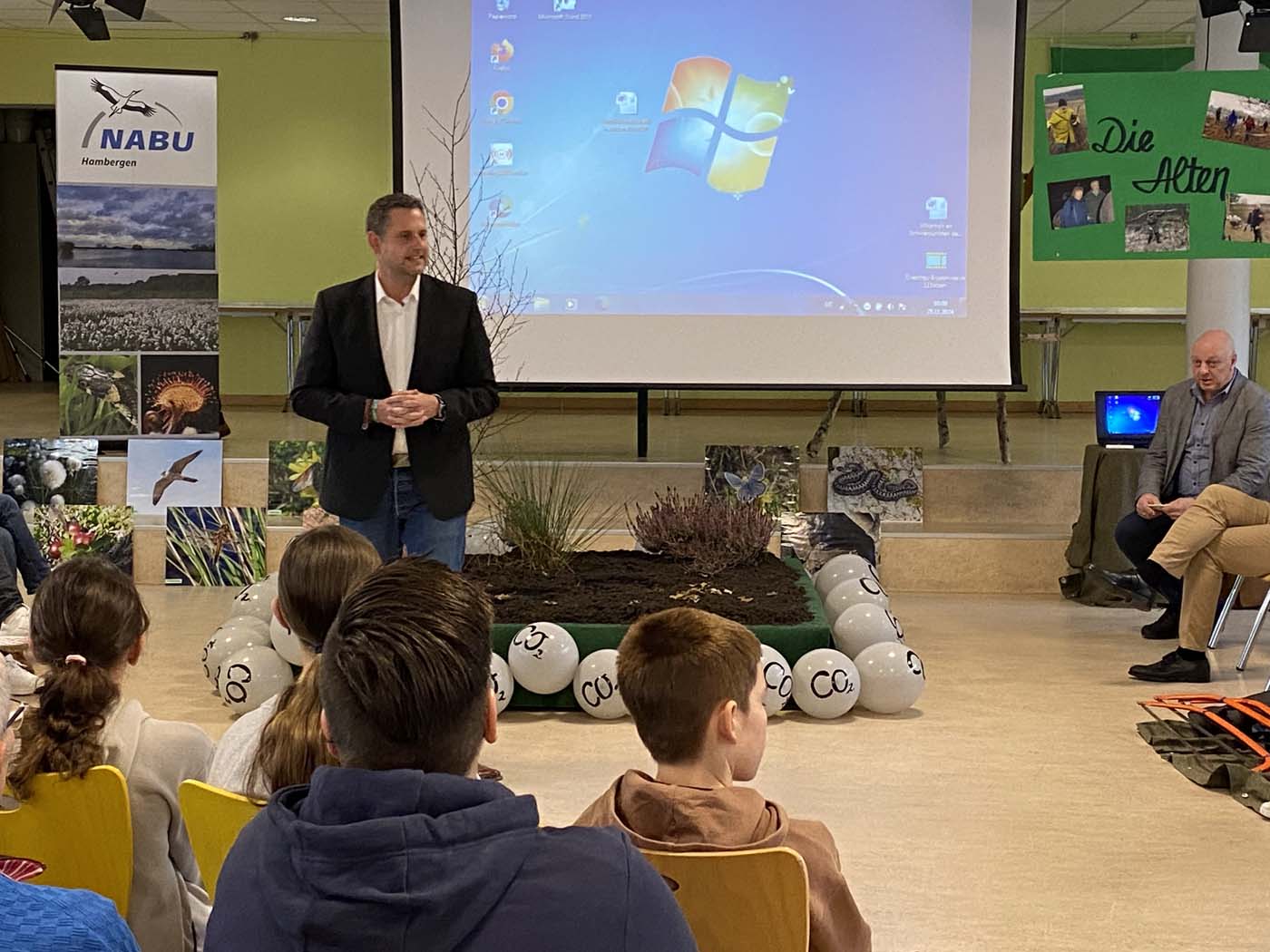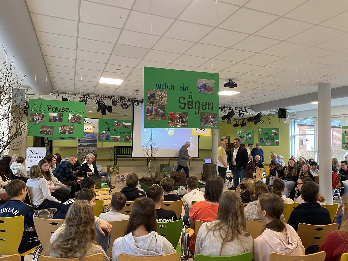 In festlichem Rahmen und thematisch mit viel Informations- und Anschauungsmaterial unterstützt fand am heutigen Montag, 25.11.2024, die diesjährige Übergabe der Moorpatenschaft an den aktuellen 7.Jahrgang statt. Mit der Überreichung des „Staffelstabes“ Moortagebuch an zwei Schüler*innen übernehmen die 7.Klassen die Aufgabe, durch Beschäftigung im Unterricht, durch Workshops vor Ort und vor allem durch das Entkusseln des Heilsmoores Ende Januar 2025 hiesige Moorgebiete zu erhalten. Der Schutz des Moores als elementarer CO2-Speicher und wirksamer Schutz des globalen Klimas steht im Mittelpunkt des Projektes, das die KGS Hambergen bereits seit über 20 Jahren in enger Kooperation mit dem NABU durchführt. Gerade die Bedeutung des langjährigen Engagements für Natur, Umwelt und Klima stellten auch die verschiedenen Redebeiträge in den Mittelpunkt. Der vorbildliche Einsatz der Schüler*innen nötigt auch der Prominenz großen Respekt ab, sodass Landrat Bernd Lütjen, Samtgemeindebürgermeister Gerd Brauns und Hambergens Gemeindebürgermeisterin Frauke Schünemann ihre Mitarbeit beim Entkusseln zusagten. Ein starkes Zeichen! Dass lokale Projekte über die Region hinaus Bedeutung erlangen können, zeigen die zahlreichen Preise, die das Moorprojekt gewinnen konnte und auch die Zusammensetzung der vielen außerschulischen Gäste. So konnten wir in diesem Jahr Besuch aus Hamburg und dem fernen Kanada willkommen heißen.