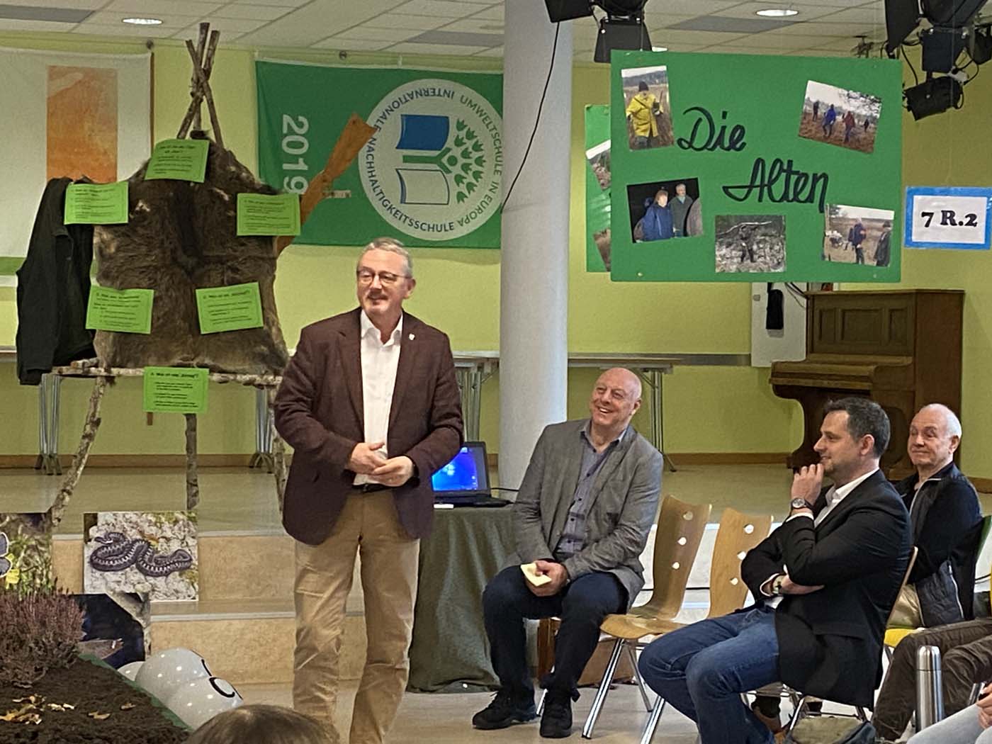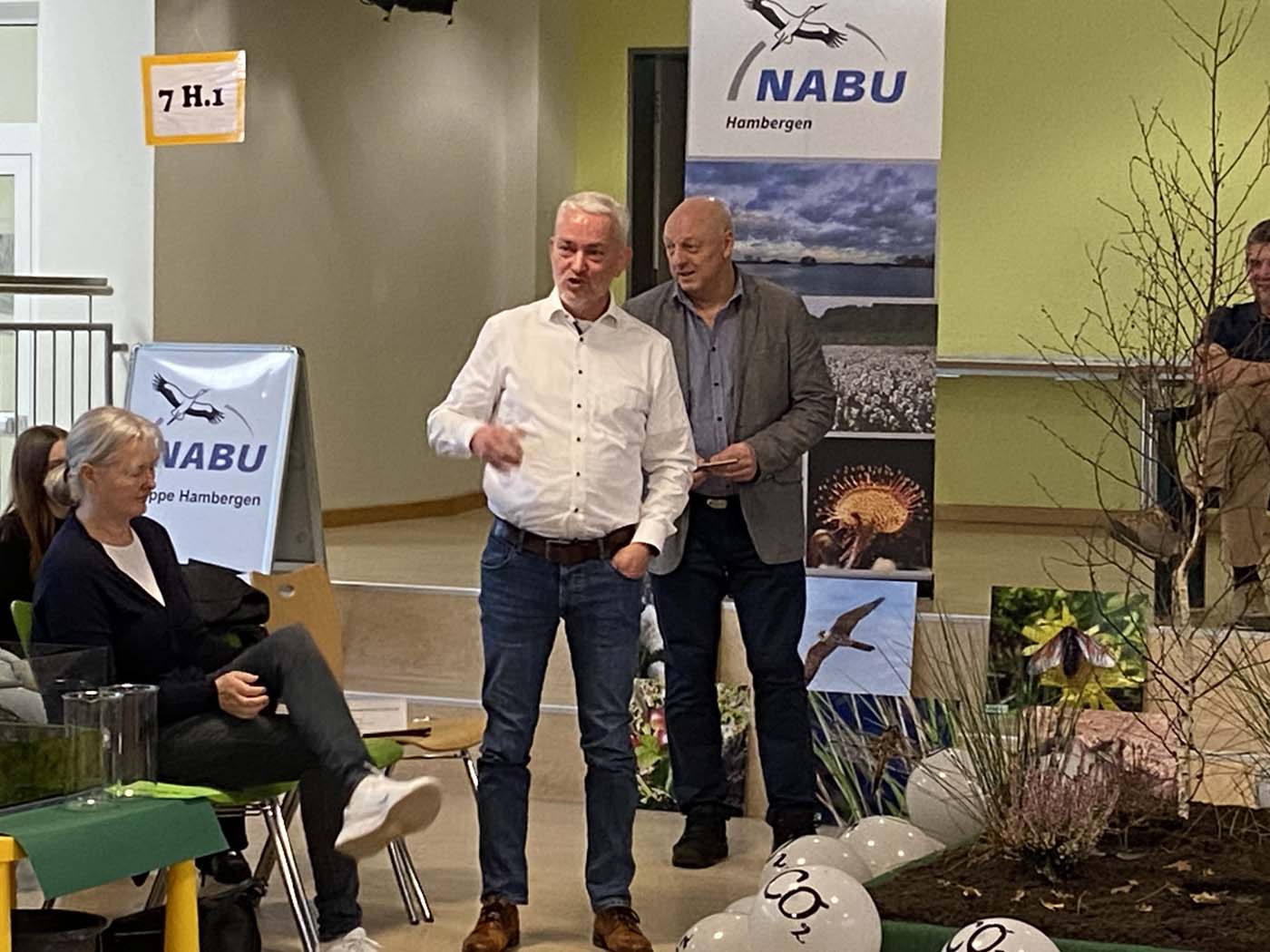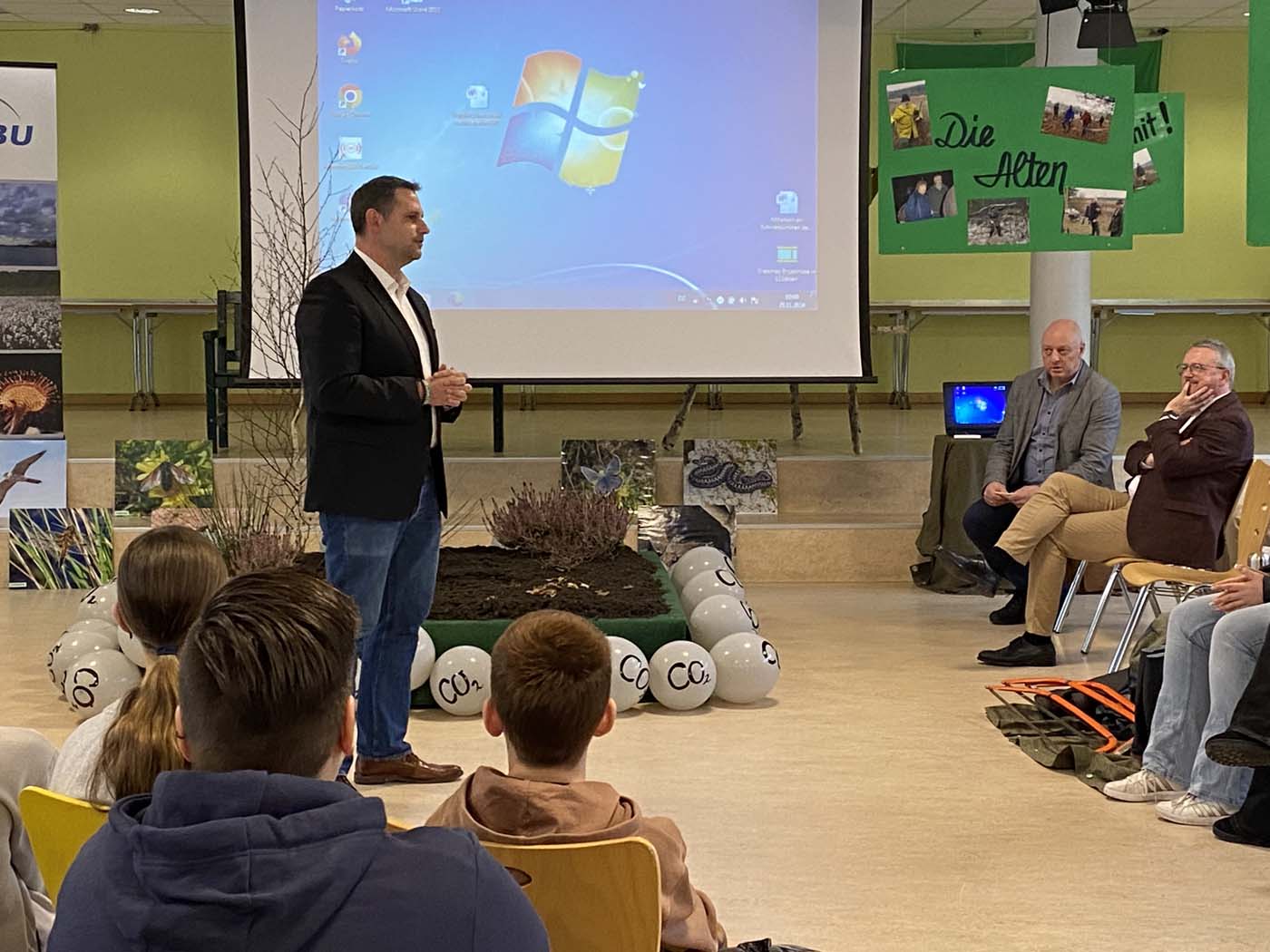 In festlichem Rahmen und thematisch mit viel Informations- und Anschauungsmaterial unterstützt fand am heutigen Montag, 25.11.2024, die diesjährige Übergabe der Moorpatenschaft an den aktuellen 7.Jahrgang statt. Mit der Überreichung des „Staffelstabes“ Moortagebuch an zwei Schüler*innen übernehmen die 7.Klassen die Aufgabe, durch Beschäftigung im Unterricht, durch Workshops vor Ort und vor allem durch das Entkusseln des Heilsmoores Ende Januar 2025 hiesige Moorgebiete zu erhalten. Der Schutz des Moores als elementarer CO2-Speicher und wirksamer Schutz des globalen Klimas steht im Mittelpunkt des Projektes, das die KGS Hambergen bereits seit über 20 Jahren in enger Kooperation mit dem NABU durchführt. Gerade die Bedeutung des langjährigen Engagements für Natur, Umwelt und Klima stellten auch die verschiedenen Redebeiträge in den Mittelpunkt. Der vorbildliche Einsatz der Schüler*innen nötigt auch der Prominenz großen Respekt ab, sodass Landrat Bernd Lütjen, Samtgemeindebürgermeister Gerd Brauns und Hambergens Gemeindebürgermeisterin Frauke Schünemann ihre Mitarbeit beim Entkusseln zusagten. Ein starkes Zeichen! Dass lokale Projekte über die Region hinaus Bedeutung erlangen können, zeigen die zahlreichen Preise, die das Moorprojekt gewinnen konnte und auch die Zusammensetzung der vielen außerschulischen Gäste. So konnten wir in diesem Jahr Besuch aus Hamburg und dem fernen Kanada willkommen heißen.