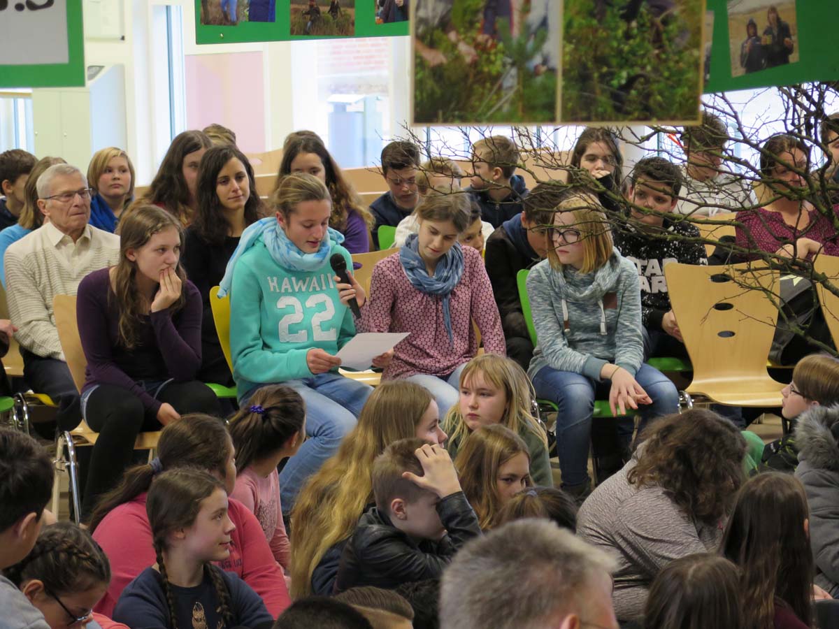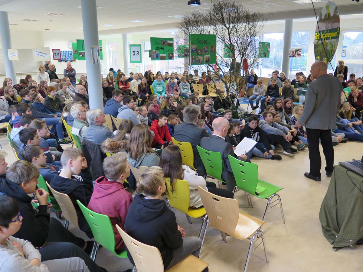 Als Höhepunkt der Veranstaltung übergaben zwei SchülerInnen des 8.Jahrgangs VertreterInnen der 7.Klassen das „Moorbuch“ und damit die offizielle Patenschaft über Heilsmoor und Springmoor. Wir sind stolz auf euch!