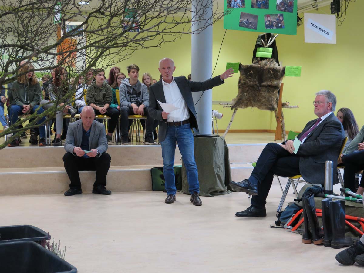 In ihren Redebeiträgen wiesen auch Herr Baltrusch, der Samtgemeindebürgermeister Kock und Herr Vollmerding von der Unteren Naturschutzbehörde des Landkreises Osterholz auf die positiven Folgen des Engagements unserer SchülerInnen hin. Darüber hinaus werden die Mädchen und Jungen auch vertraut gemacht mit der hiesigen Flora und Fauna und der Wichtigkeit lokaler Biotope. Dazu haben alle 7.Klassen bereits am 5.September 2017 einen Kennlerntag im Heilsmoor erleben dürfen. Freiwillige HelferInnen von NABU, Kreisjägerschaft und der Biologischen Station Osterholz (BIOS) zeigten den Kindern Pflanzen und Tiere des Moores und machten sie vertraut mit Gewöllen und Losungen. Darüber hinaus durften sie schon ein erstes Mal Hand anlegen und mit Astschere und Säge aktiv entkusseln und mit allen Sinnen das Moor erleben. Welch großen Spaß ein solcher Tag in der Natur macht, zeigte sich bei der Präsentation zahlreicher Fotos dieses Moor-Schnuppertages.