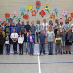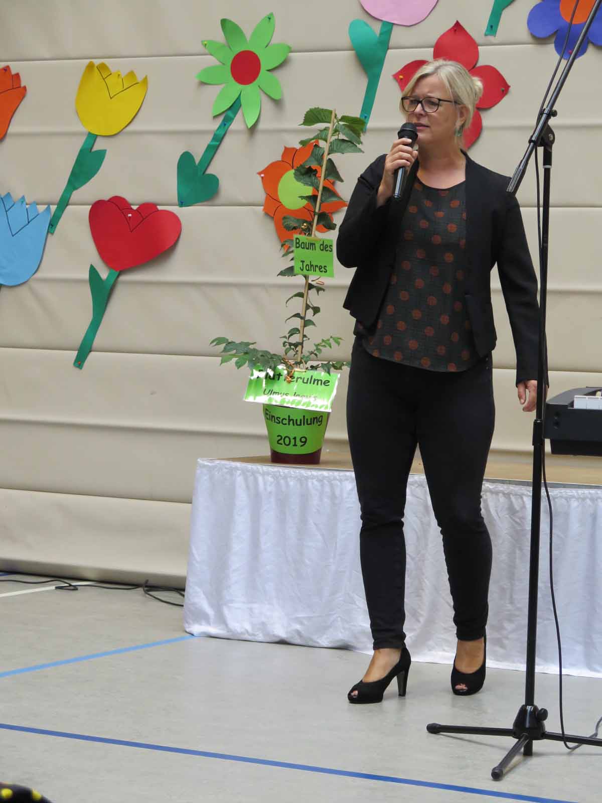 Zwischendurch präsentierte Frau Brede den vom NABU gestifteten Baum des Jahres, in diesem Jahr die Flatterulme, als Geschenk an die neuen BaumpatInnen, die Kinder des 5. Jahrgangs. Stellvertretend nahm Frau Teichert als Jahrgangsleiterin den Baum in Empfang.