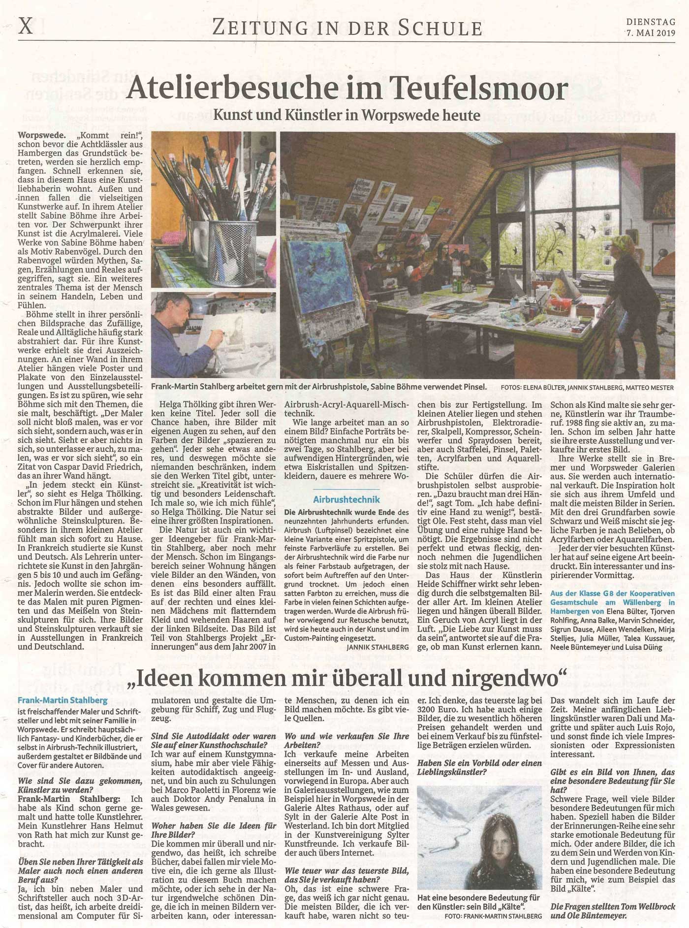 Im Rahmen des Projekts „Zeitung in der Schule“ (ZiSch) besuchte der Gymnasialkurs Deutsch Künstlerinnen und Künstler aus Worpswede und verarbeitete seine Eindrücke in Form einer Zeitungsseite in der Sonderbeilage des Weser-Kuriers. Gut gemacht!