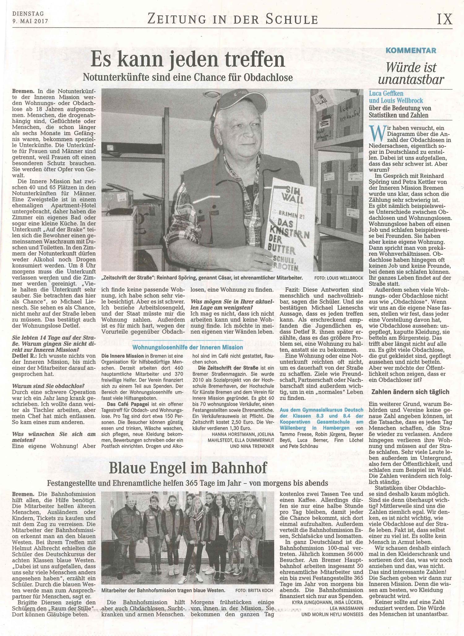 Mit dem Thema Obdachlosigkeit, ihren Ursachen und Folgen, hat sich der Deutsch-Kurs von Frau Teichert aus dem 8.Jahrgang intensiv beschäftigt. In der aktuellen ZiSch-Beilage des Weser-Kuriers finden sich die Ergebnisse von Recherche und Auseinandersetzung mit diesem brisanten gesellschaftlichen Bereich.
