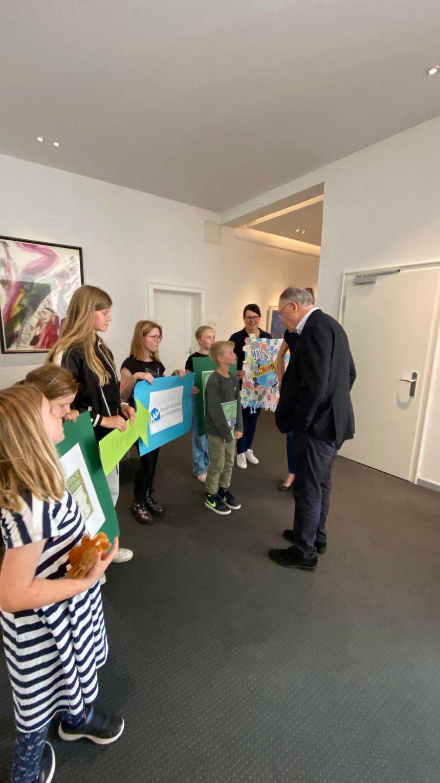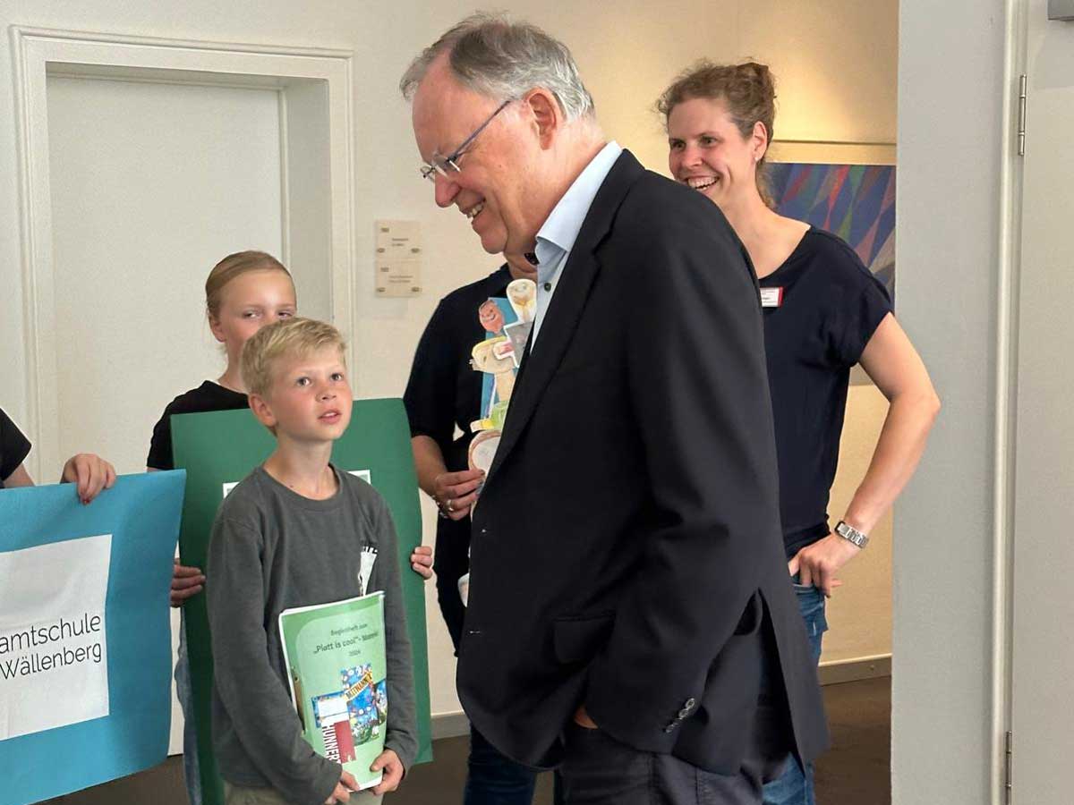 „Freedag is Plattdag/ Fräidai is Seelterdai“ unter diesem Motto wird seit mittlerweile 9 Jahren – seit 8 Jahren unter der Schirmherrschaft von Ministerpräsident Stephan Weil – an jedem Freitag im September Platt geschnackt. Seit dem letzten Jahr kooperiert die KGS Hambergen mit der Grundschule Wallhöfen in diesem Bereich. Frau Nele Ohlsen bietet den Schüler:innen des 5. Jahrgang und 7. Jahrgangs an der KGS Hambergen Gelegenheit Platt zu schnacken. Wir freuen uns sehr über diese Zusammenarbeit. Bisheriger Höhepunkt in diesem Schuljahr war sicherlich der Besuch von Schüler:innen der KGS Hambergen und der Grundschule Wallhöfen in der Staatskanzlei in Hannover am 4. September 2024. Hier wurden sie durch den Ministerpräsidenten empfangen und konnten unser Projekt vorstellen – stolze Gesichter bei allen Beteiligten. Große Freude auch in der KGS, denn nur wenige Schulen in ganz Niedersachsen hatten das Glück, nach Hannover eingeladen zu werden.